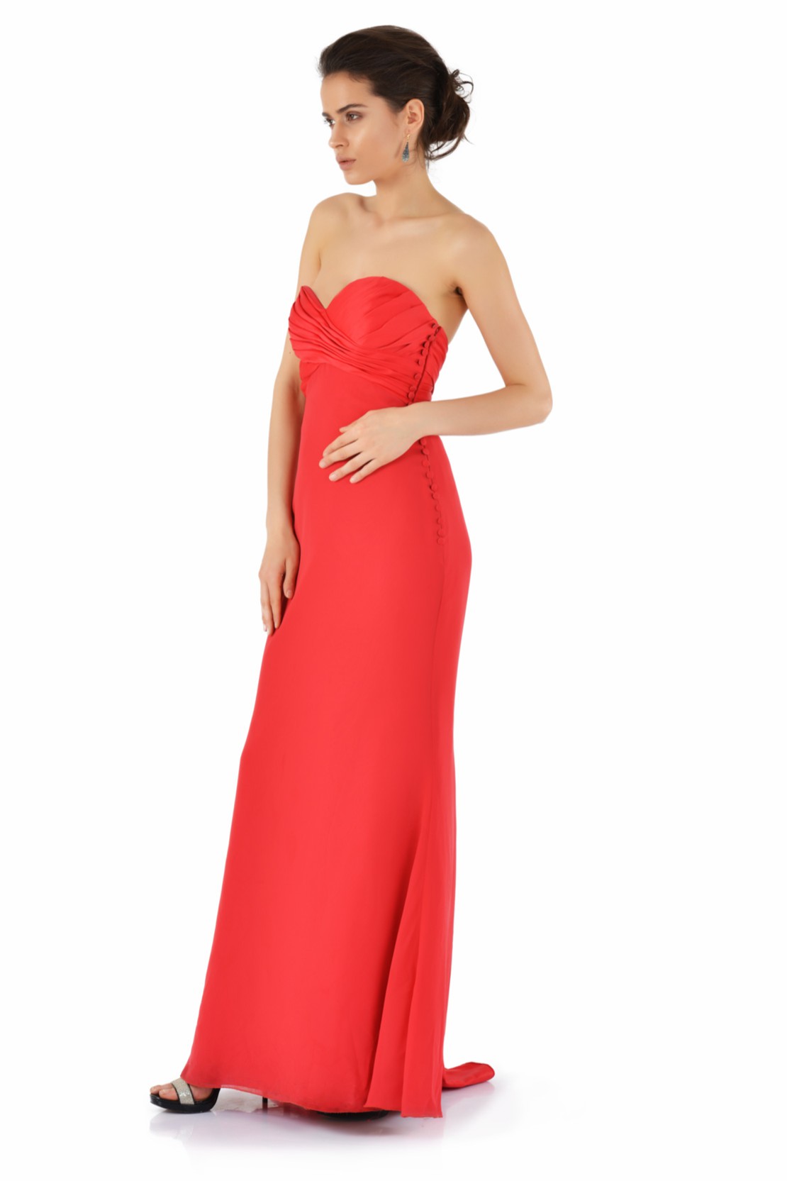 Straplez Saten ve Tül Arkası Kurdela Detaylı Gece Elbisesi