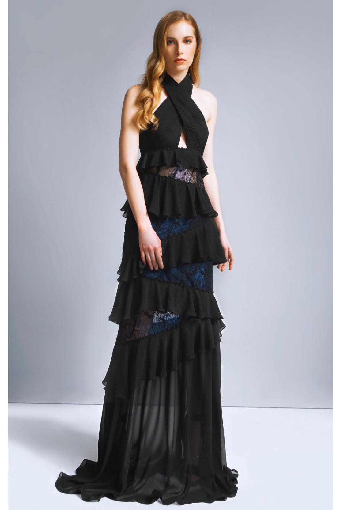 Göğüs Çapraz Boyundan Bantlı Sırtı Açık Etekleri Fırfırlı Dantel ve Şifon Gece Elbisesi