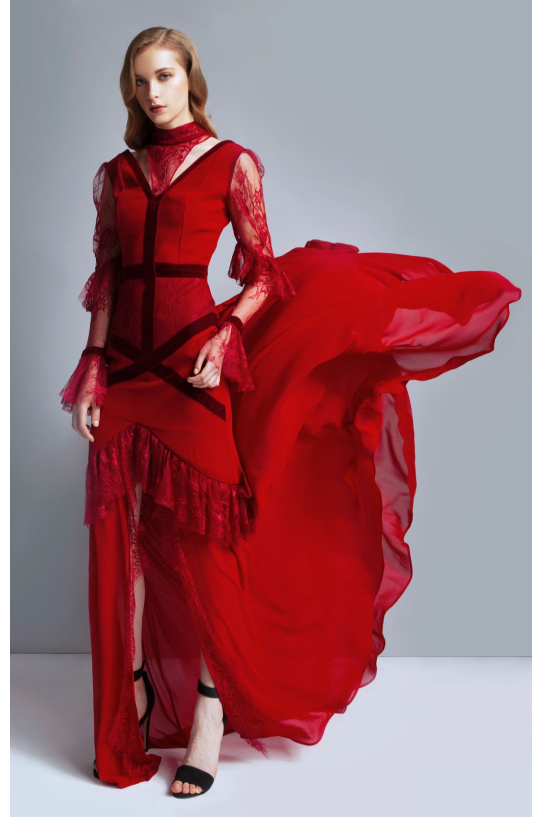 Boyun Kısmı Dantel Detaylı, Kolları Dantel ve Fırfırlı Dizden Aşağısı Şifon ve Önden Yırtmaçlı, Kuyruklu Gece Elbisesi
