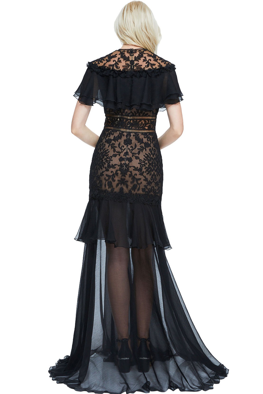 Kayık Yaka Göğsü Dantelli ve Şifon Volanlı Etekleri Şifon İnen Uzun Gece Elbisesi