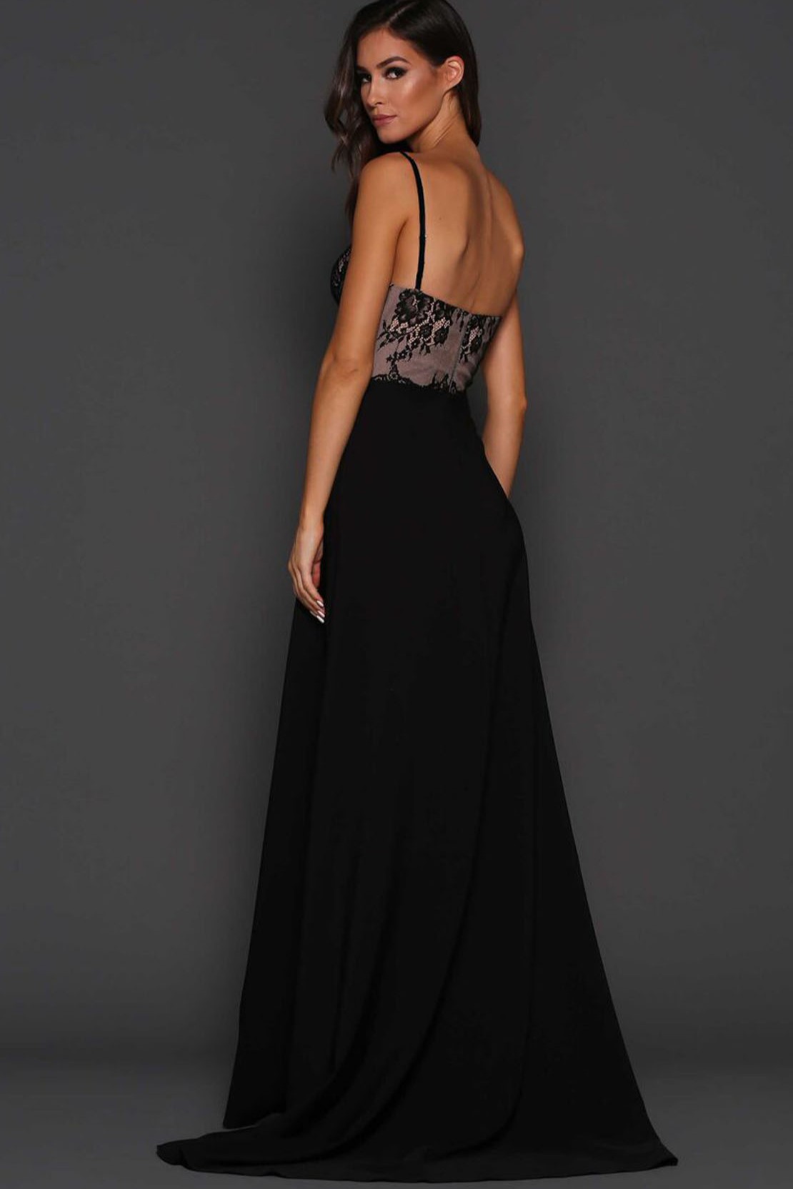 Üstü Dantelli Önden Yırtmaçlı Kuyruklu Gece Elbisesi
