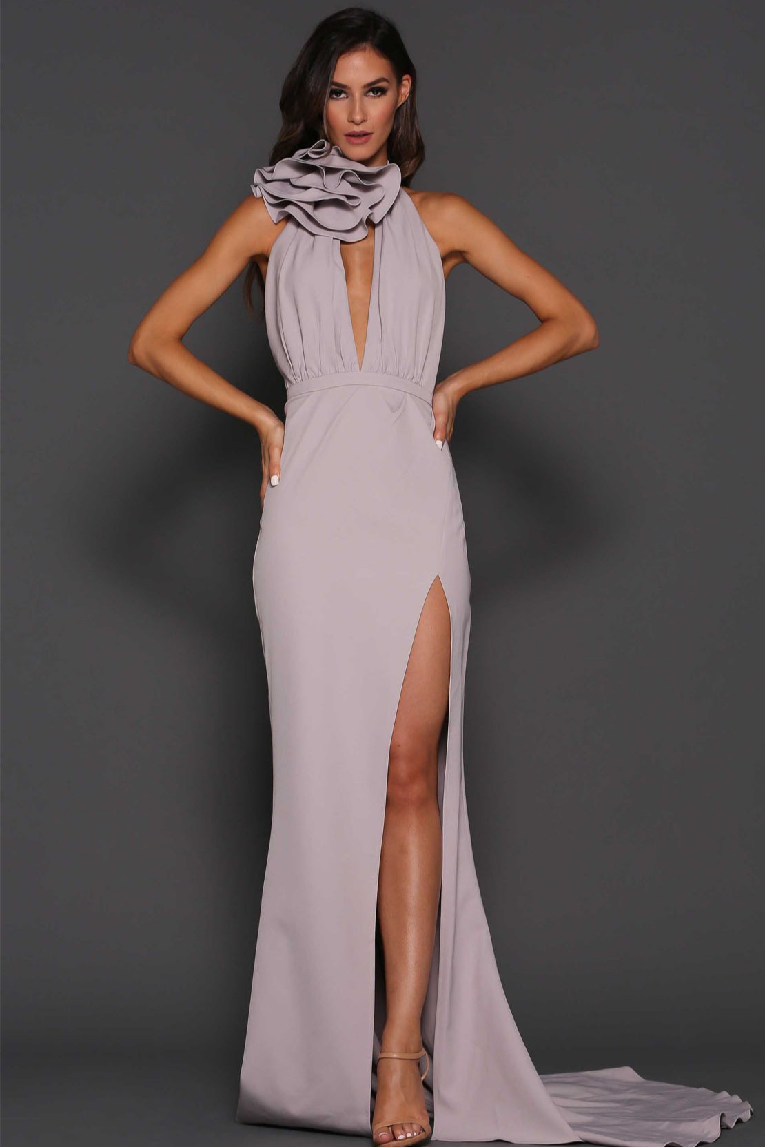 Göğüs ve Sırt Dekolteli Boynu Güllü Önden Yırtmaçlı Gece Elbisesi