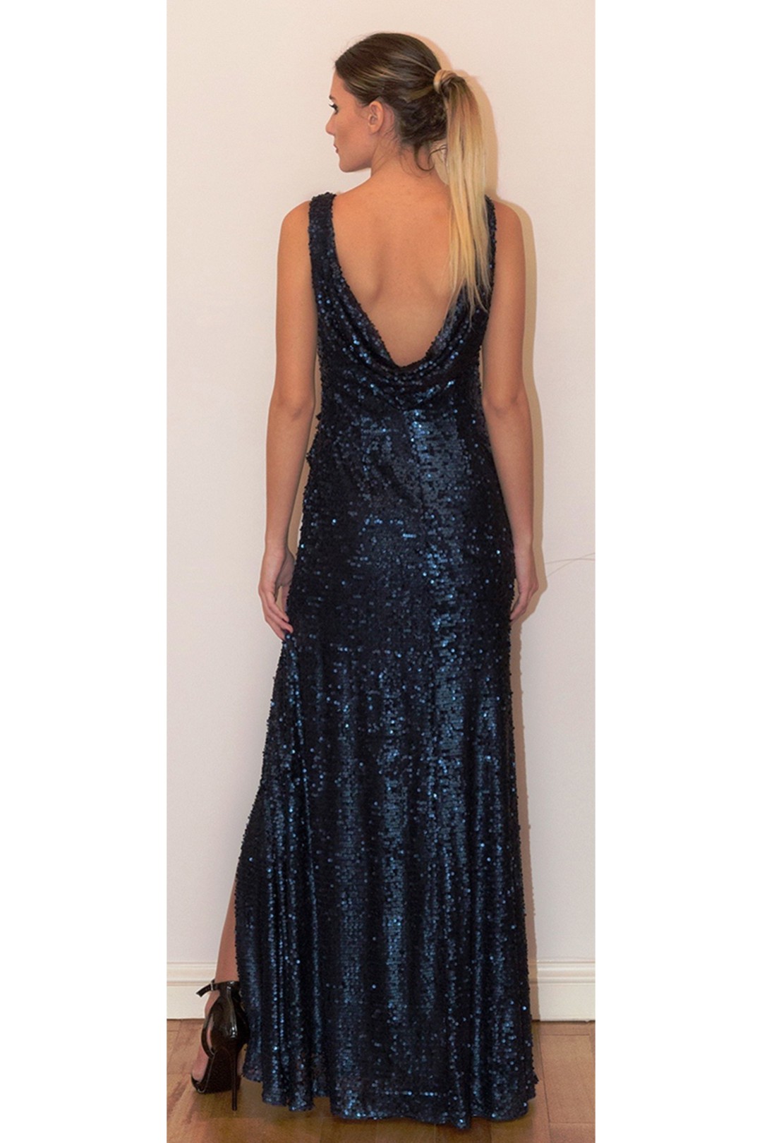 Kalın Askılı Sırtı Açık Dökümlü Önden Yırtmaçlı Beli Drapeli Mat Payetli Gece Elbisesi