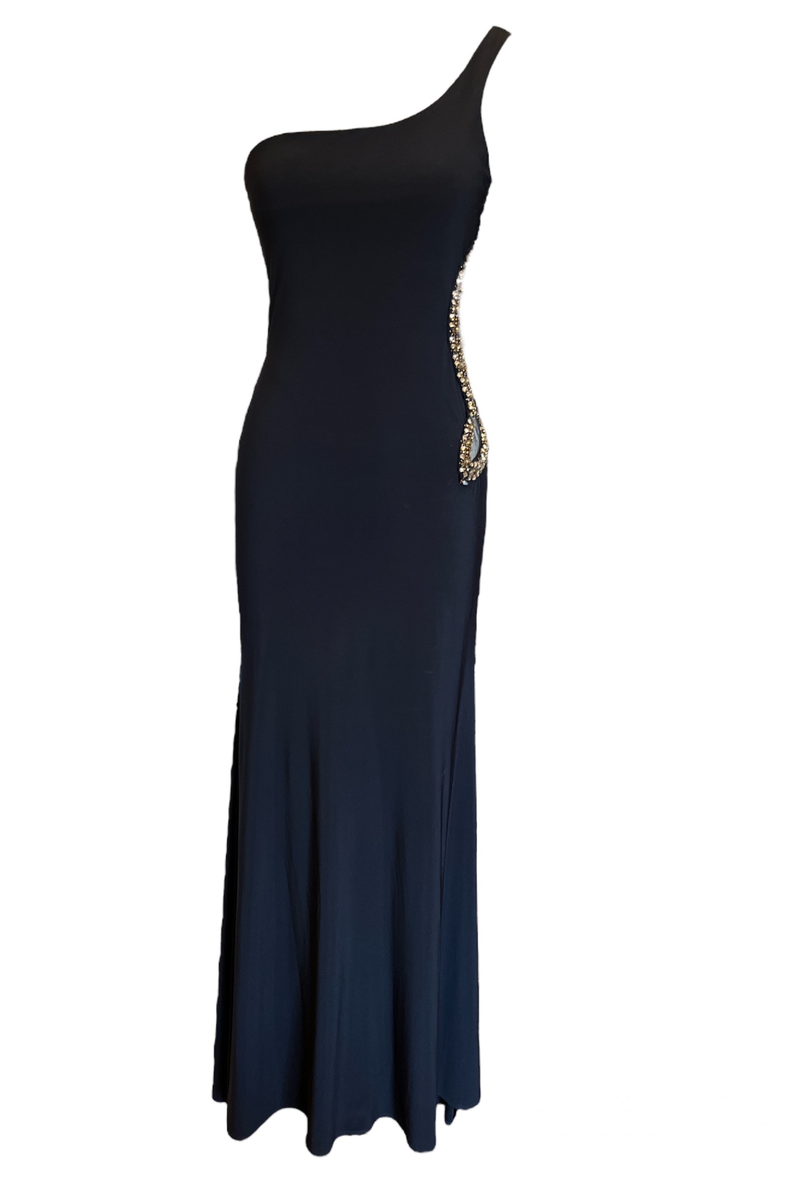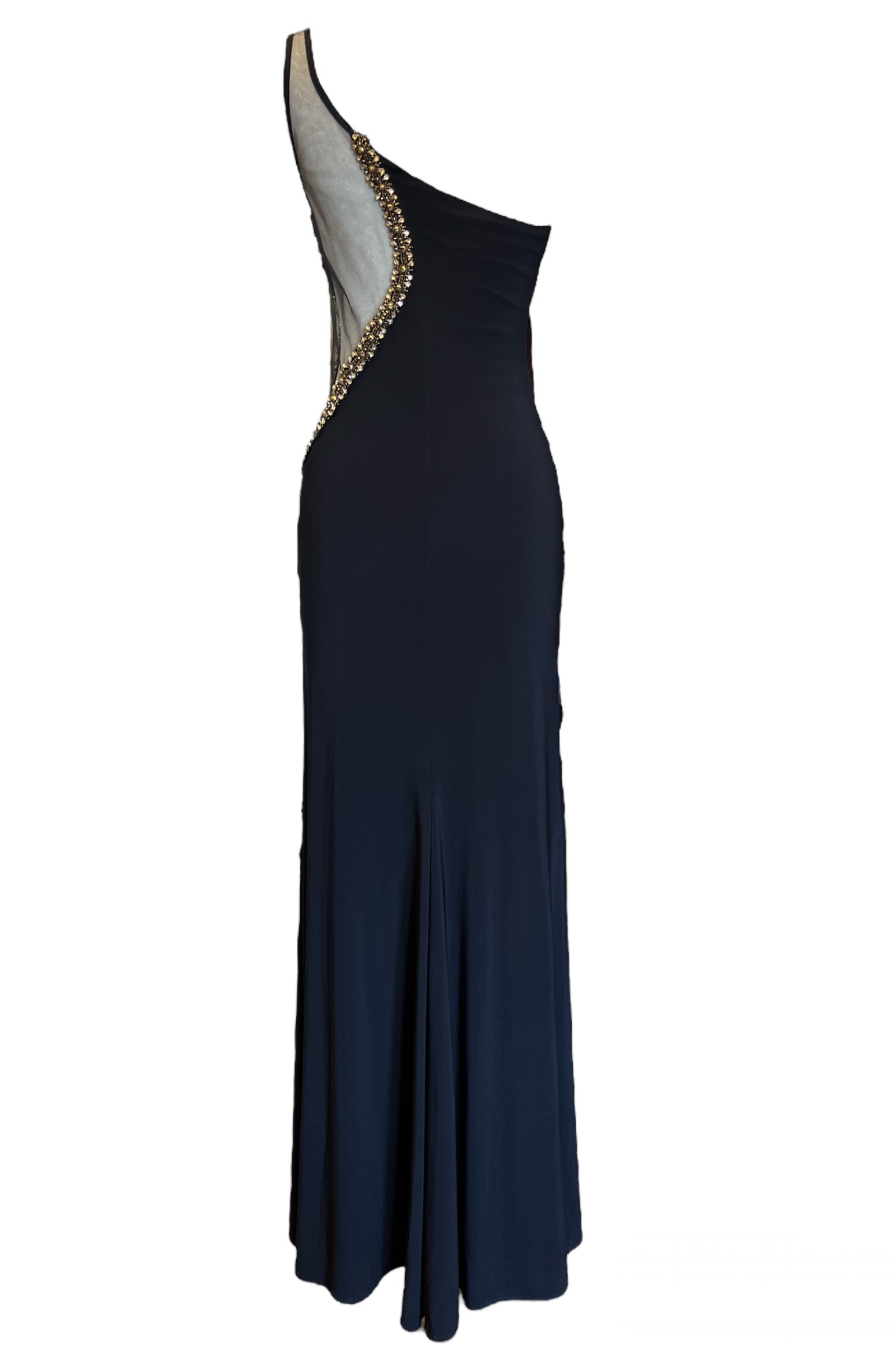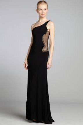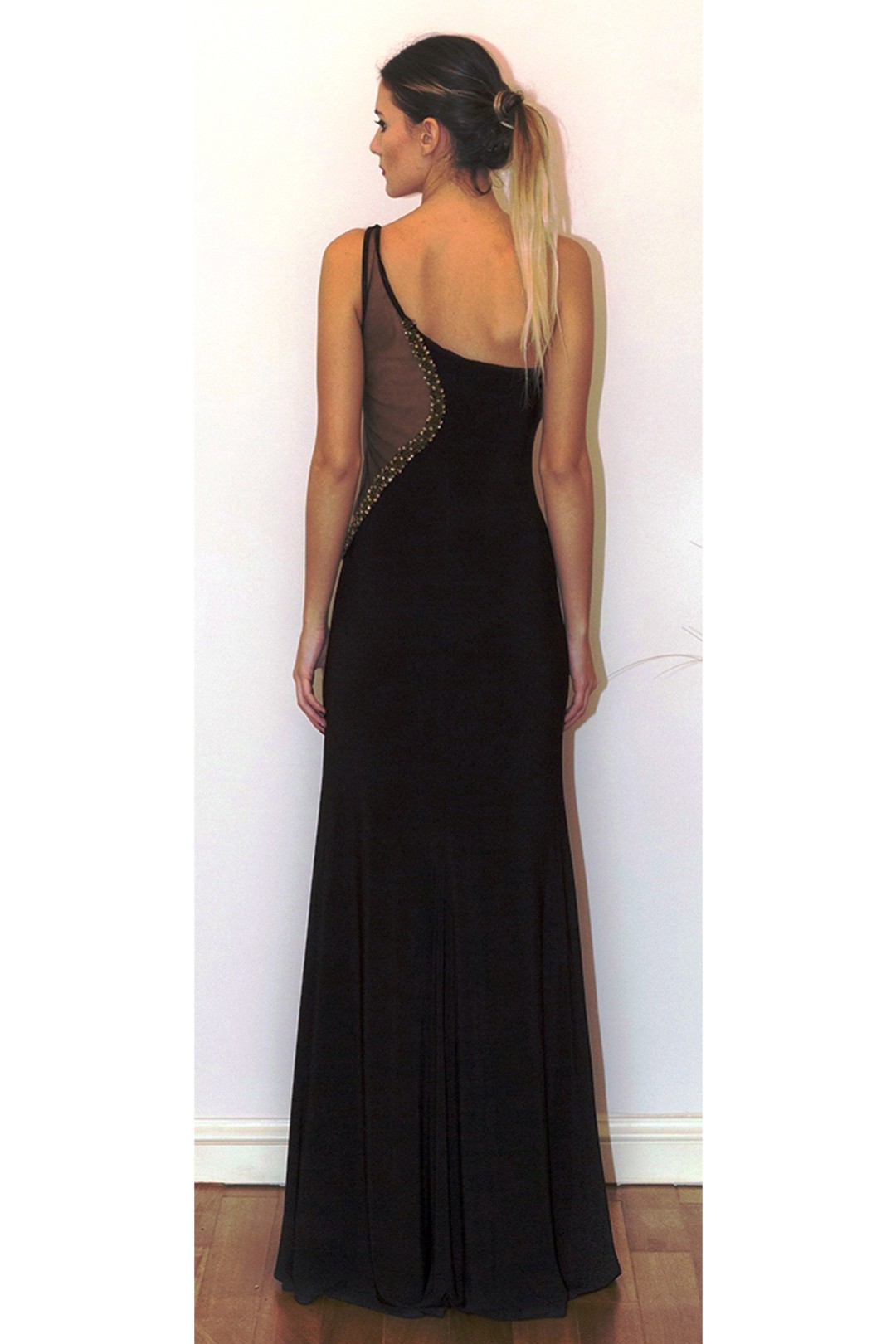 Tek omuz bel kısmı siyah tül kaplı pencere detaylı ve işlemeli uzun gece elbisesi