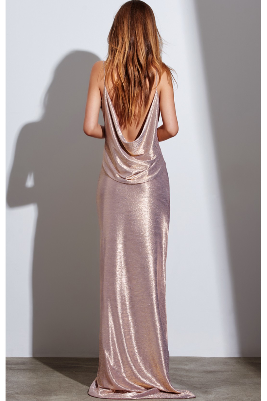 Derin V Yaka Degaje Sırt Dekolteli Yandan Yırtmaçlı Kendinden Simli Gece Elbisesi