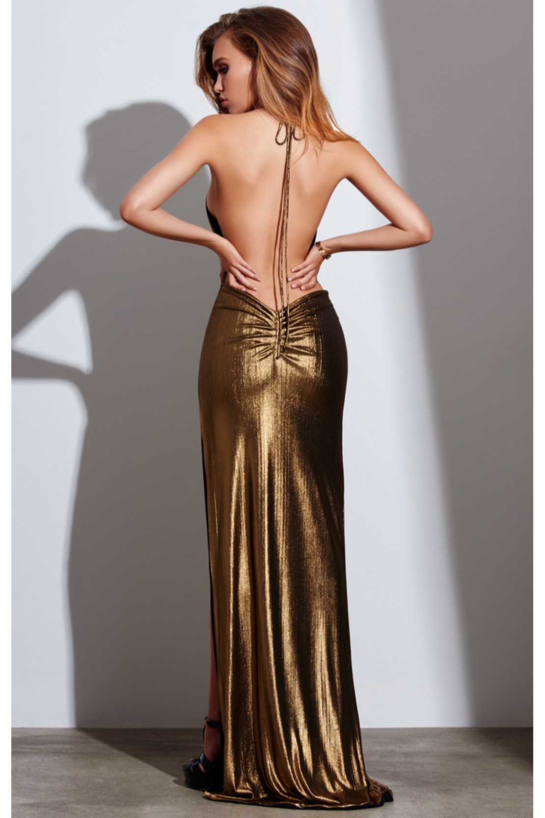 Degaje Yakalı Sırt Dekolteli Yandan Yırtmaçlı Gece Elbisesi