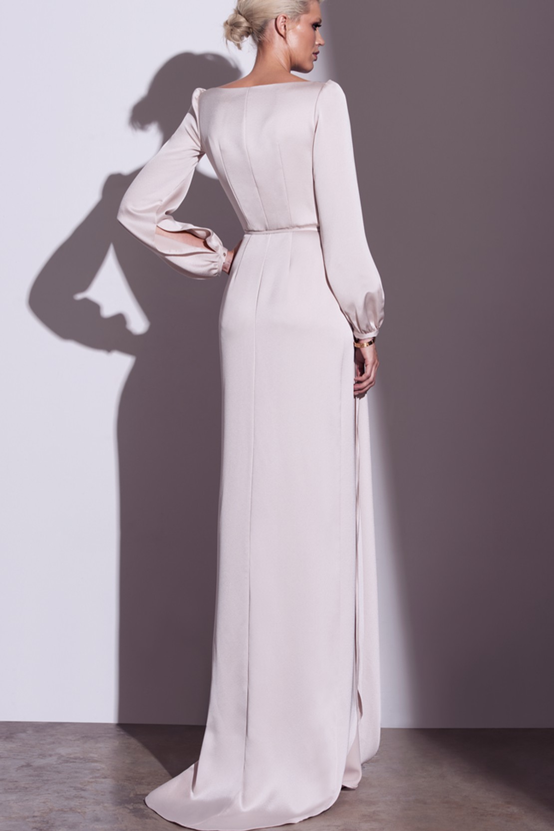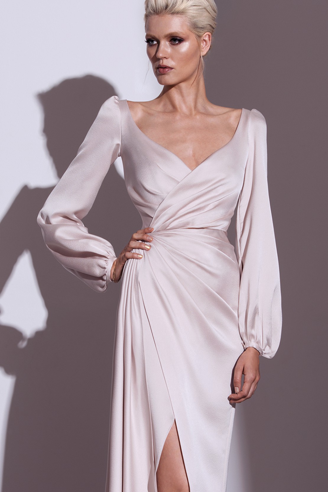 Derin Göğüs ve Bacak Dekolteli Uzun Kollu İpek Saten Gece Elbisesi