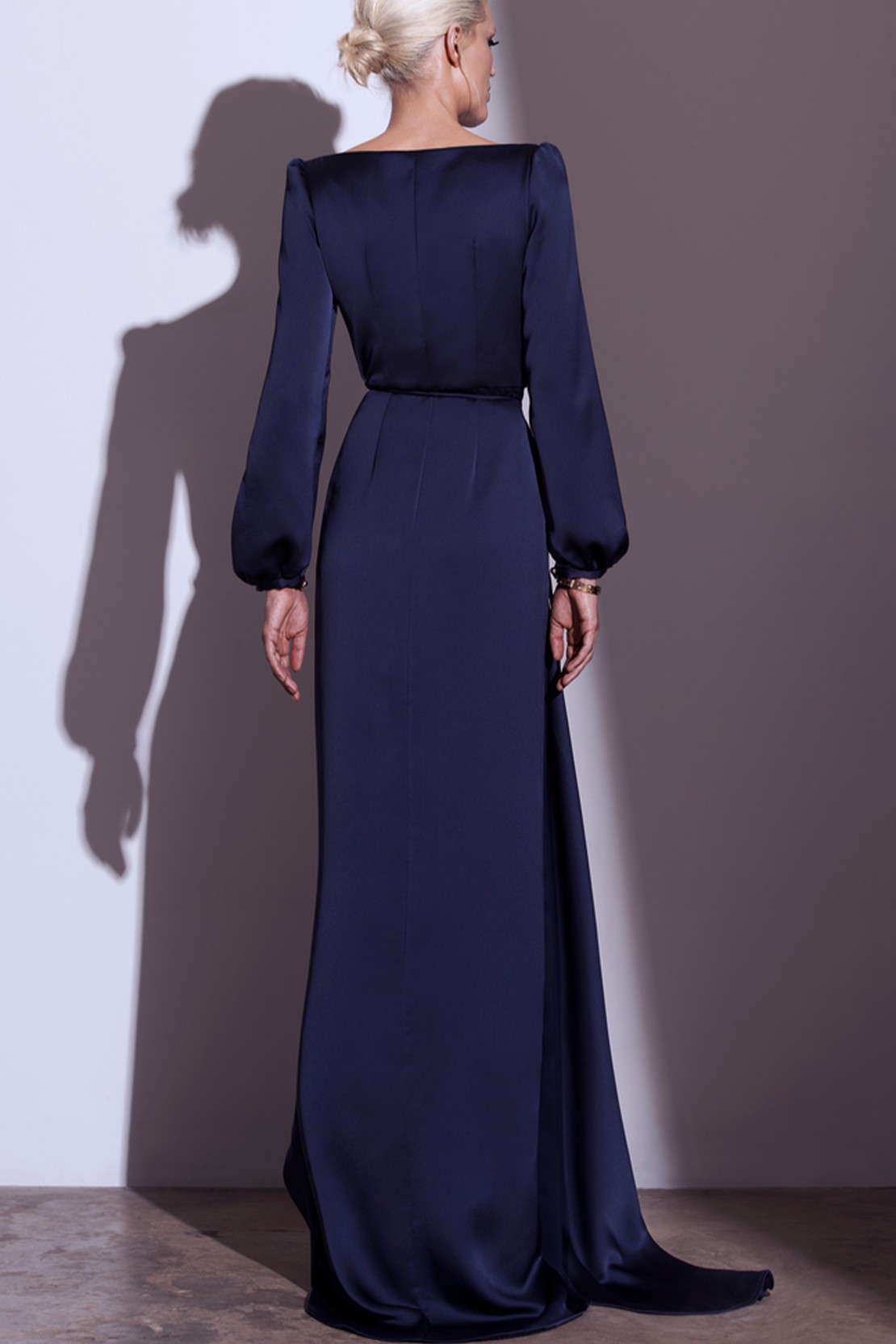 Derin Göğüs ve Bacak Dekolteli Uzun Kollu İpek Saten Gece Elbisesi
