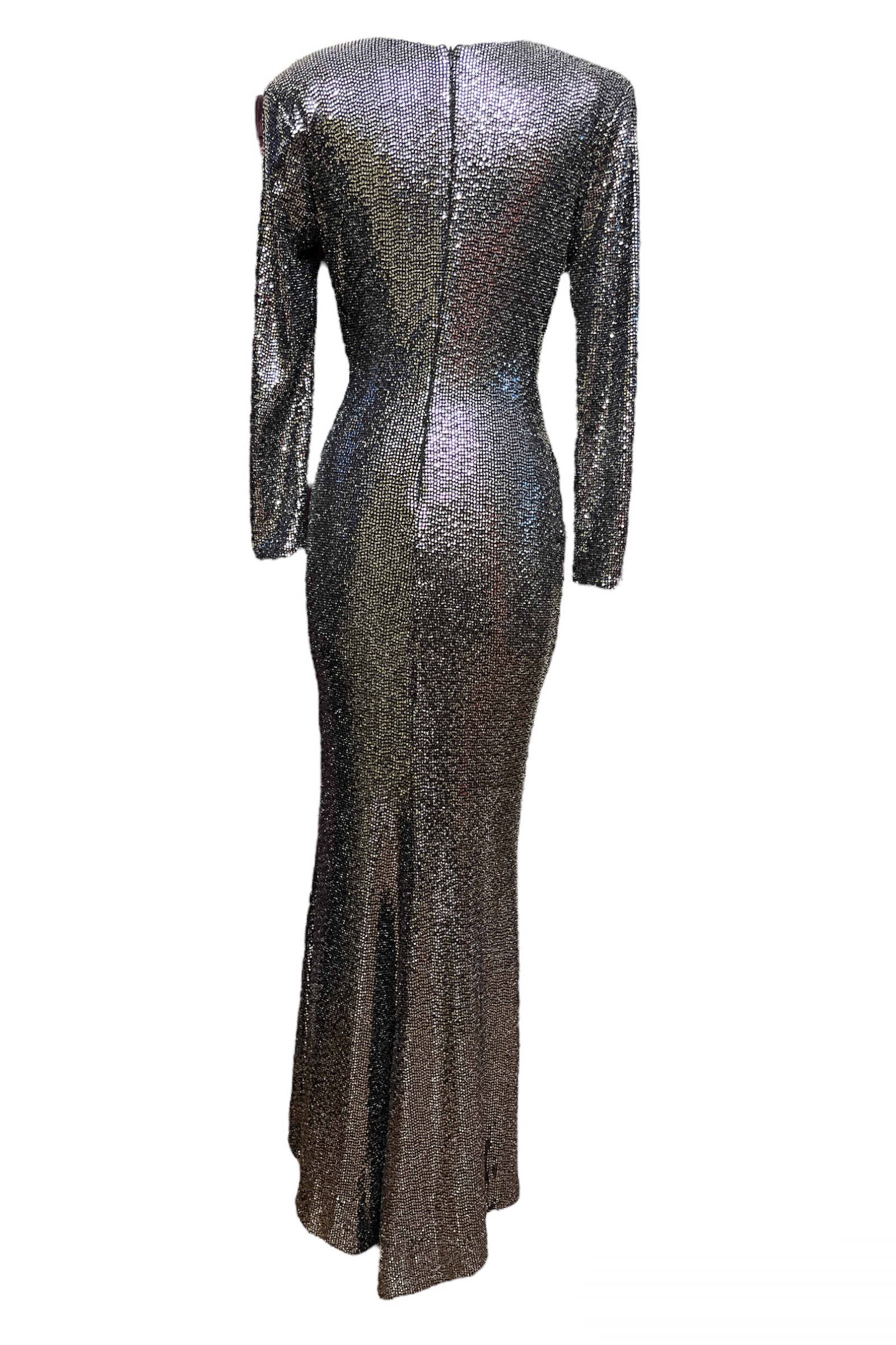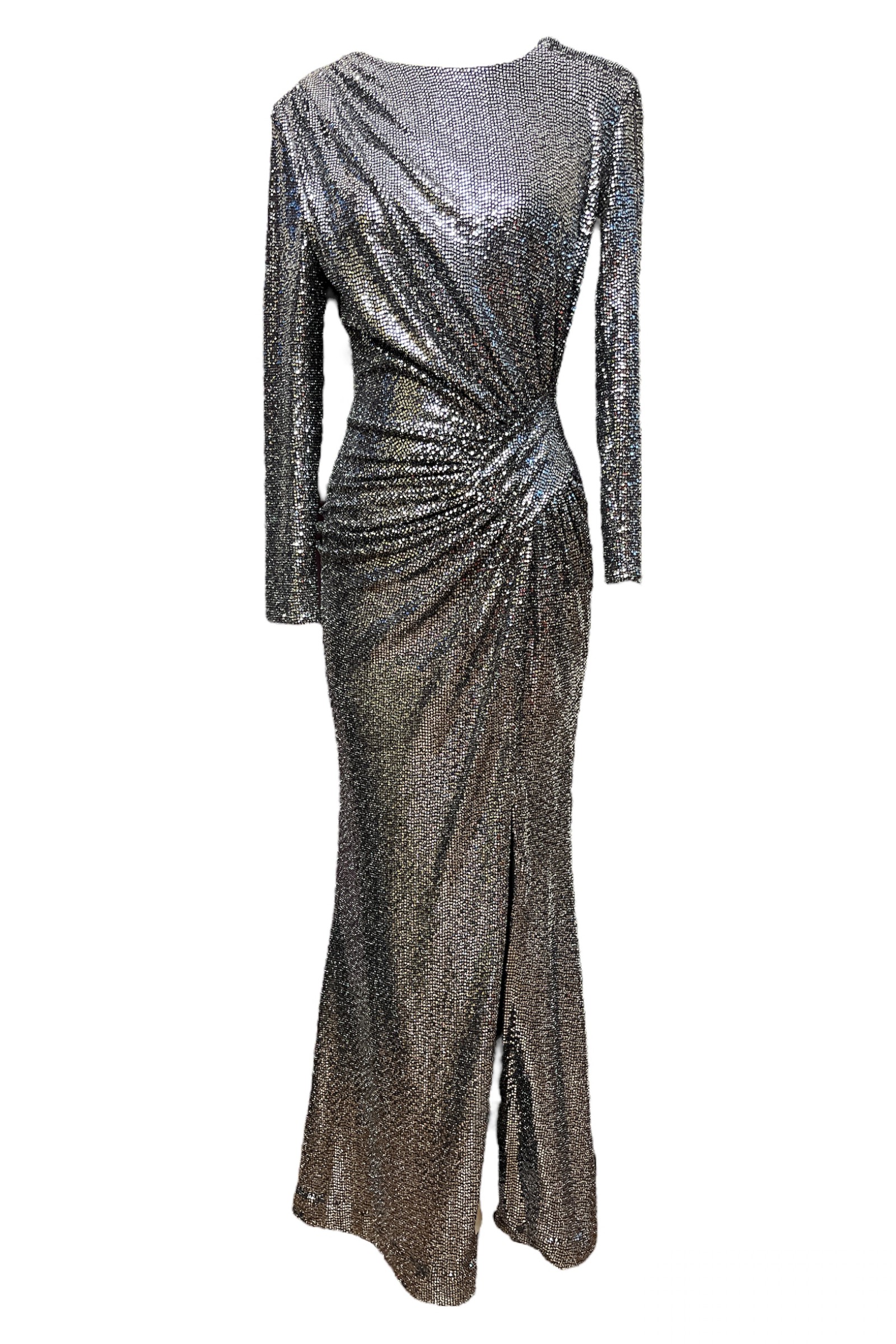 Uzun Kollu Beli Drapeli Yırtmaçlı Kendinden Işıltılı Gece Elbisesi