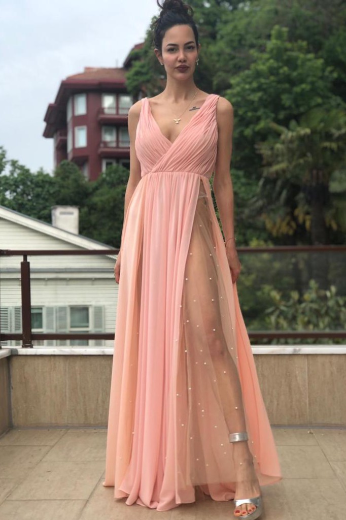 Göğüs ve Sırt Drapeli ve Derin Dekolteli Etek Kısmı Çift Yırtmaçlı Alt Etekleri Tül Üstüne İnci İşlemeli Şifon Gece Elbisesi