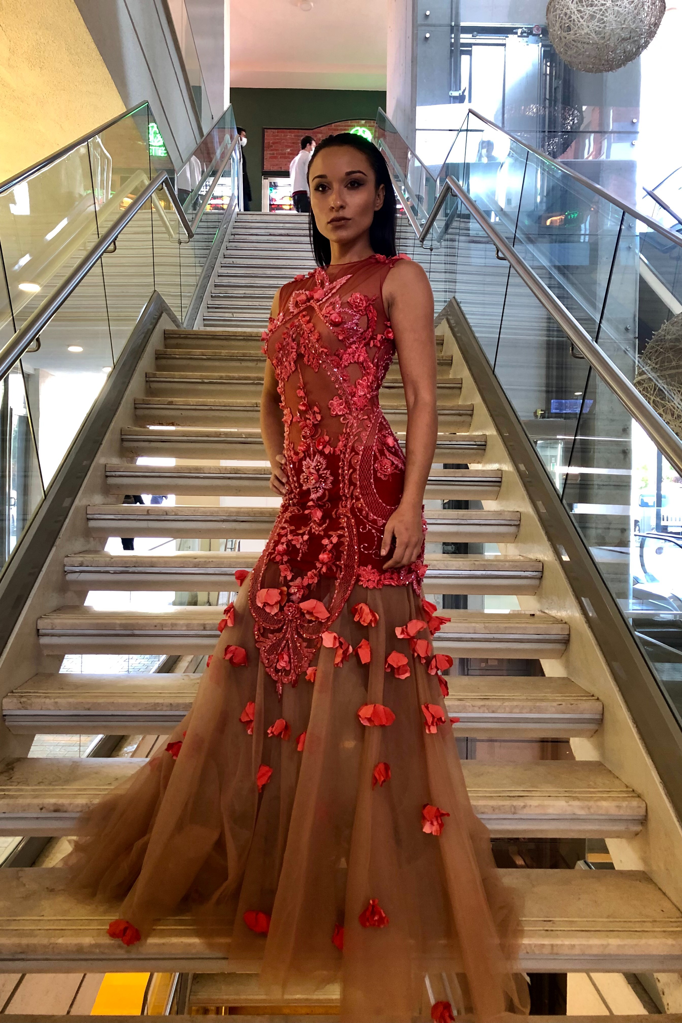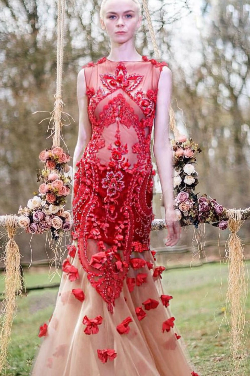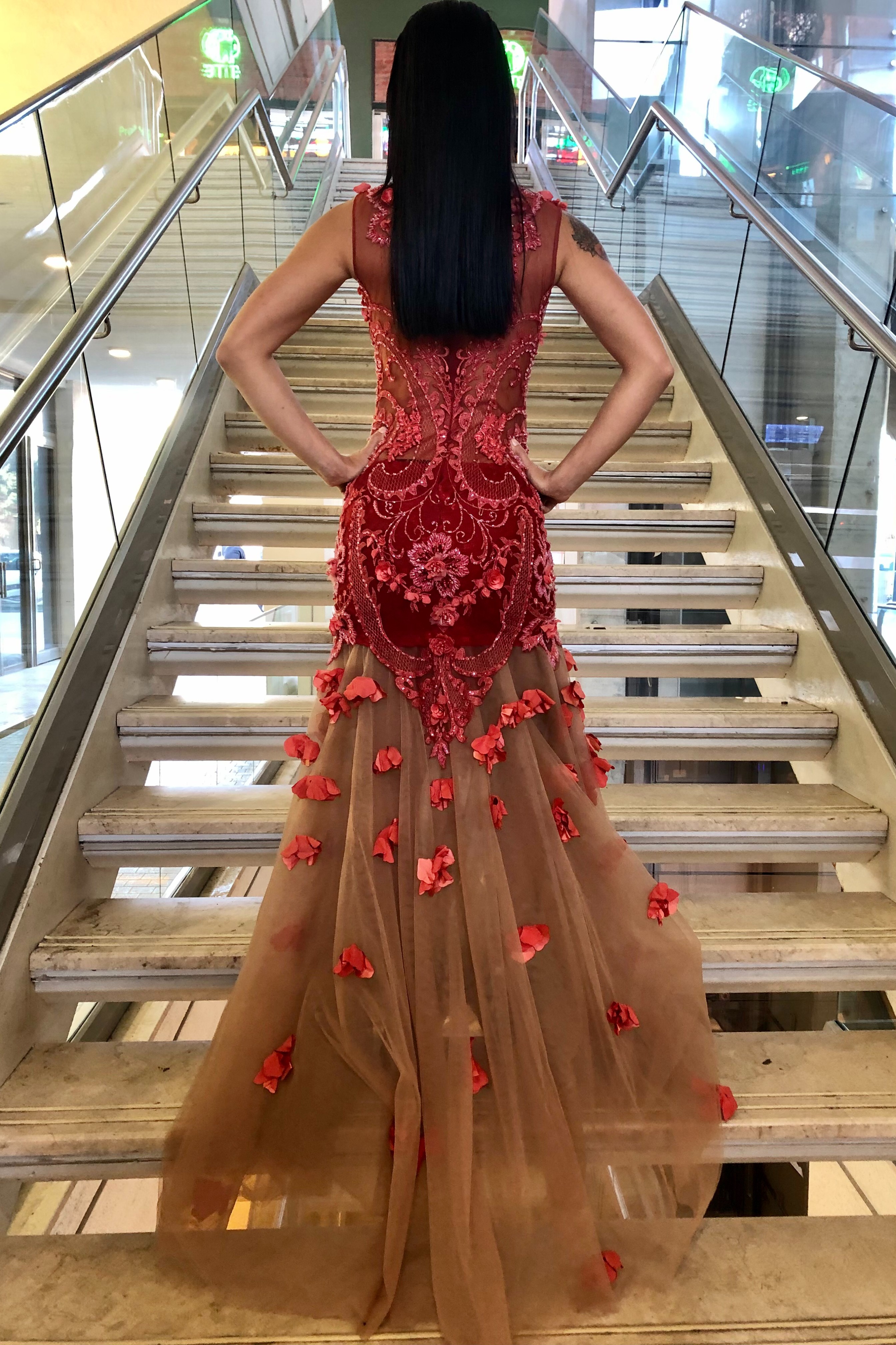 Boncuk ve 3 Boyutlu Çiçek İşlemeli Balık Gece Elbisesi