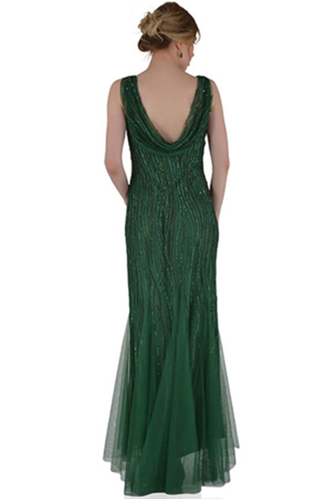 Şifon Degaje Sırt ve Yaka Boncuk İşlemeli Gece Elbisesi