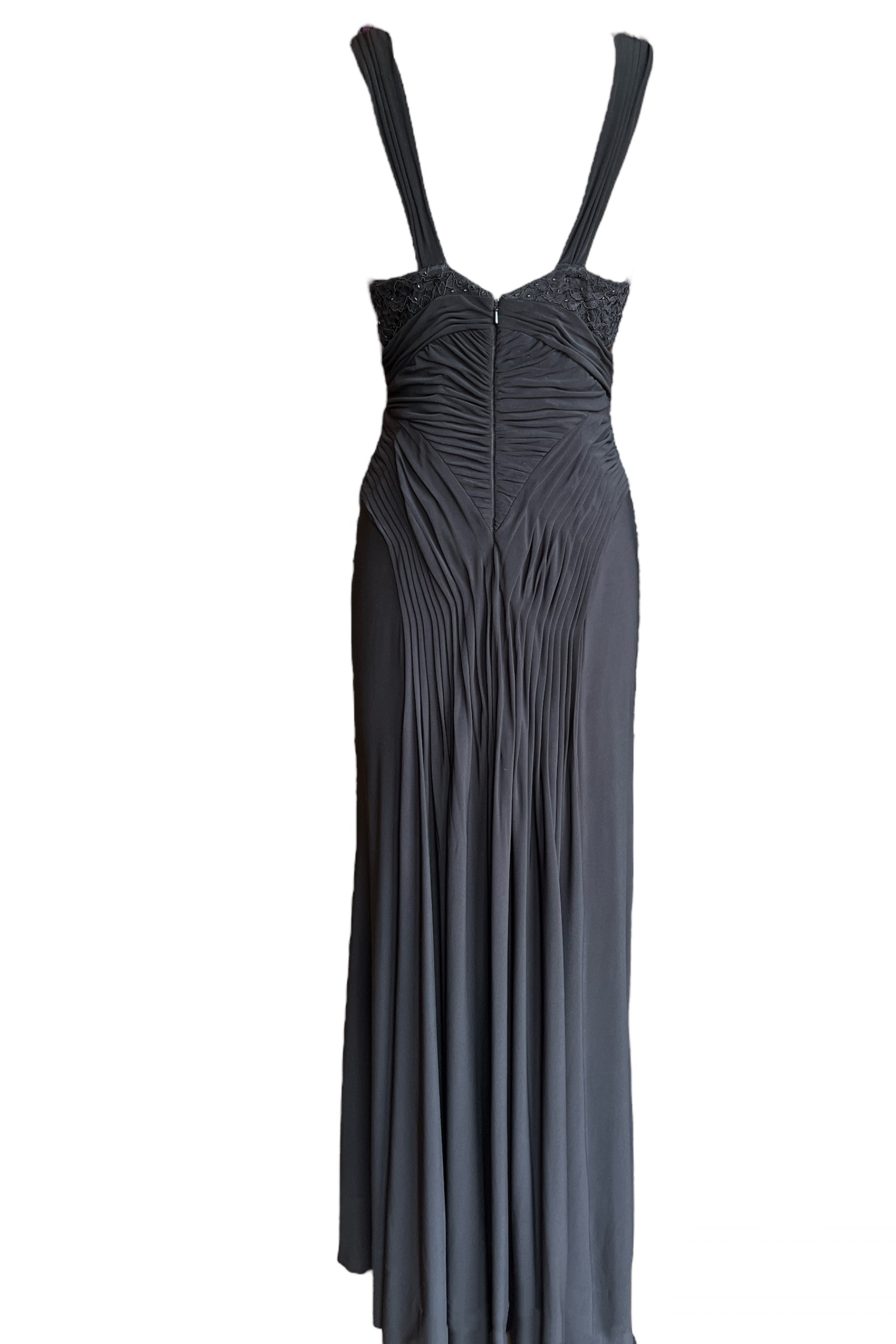 Derin V yaka göğüs kısmı boncuk işlemeli önü drapeli önden yırtmaçlı uzun gece elbisesi