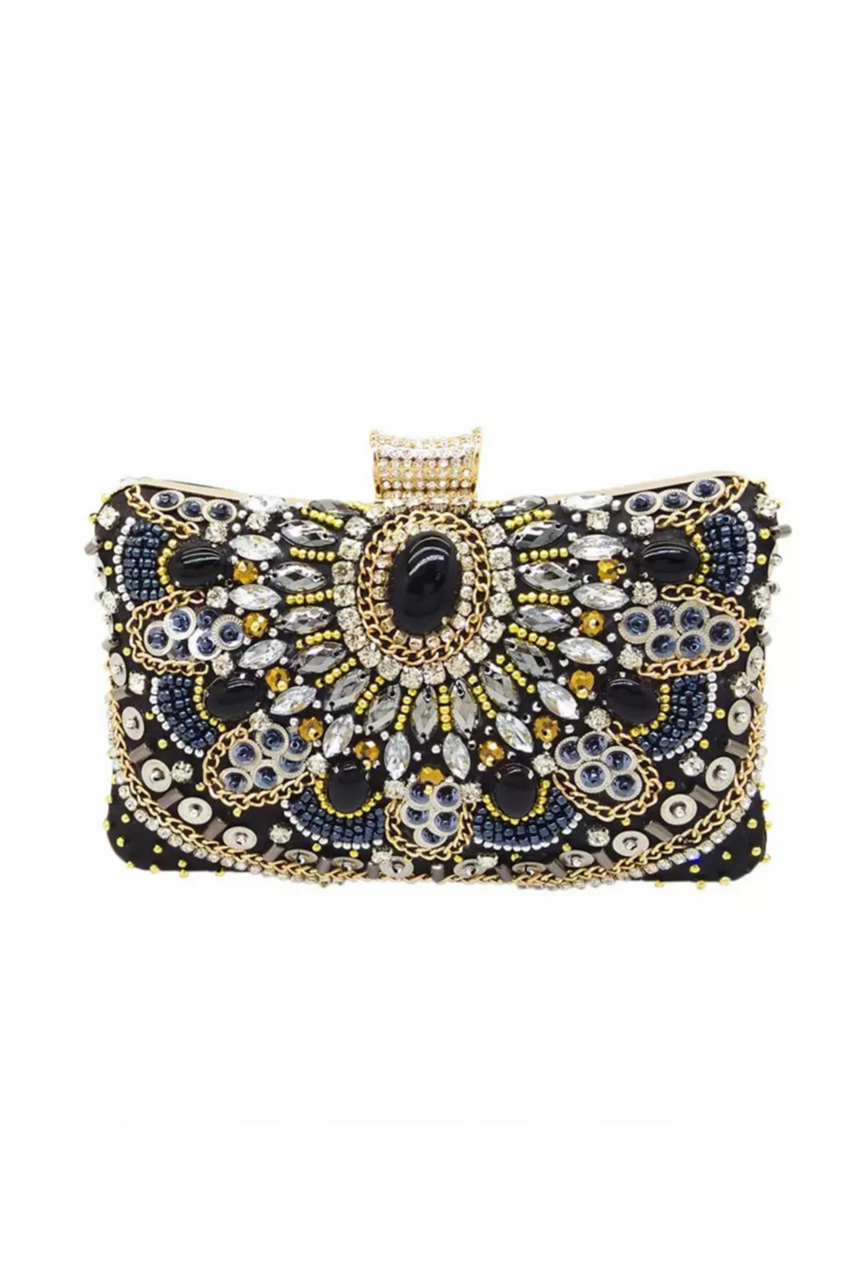 Siyah boncuk işlemeli metal gece çantası