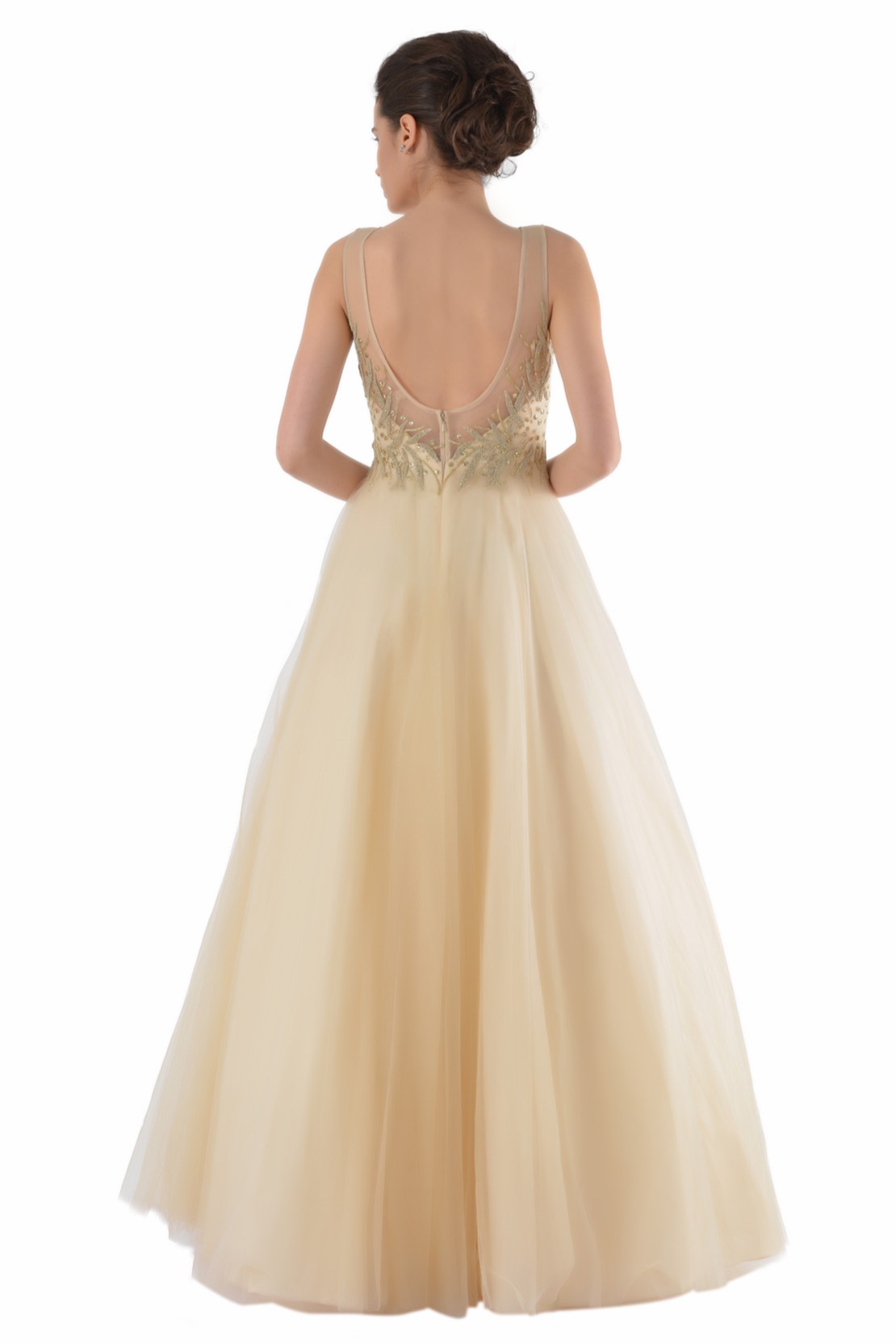 Kalın Askılı Göğsü Hayalet Tüllü Üstü İşlemeli Sırt Dekolteli Kabarık Gece Elbisesi