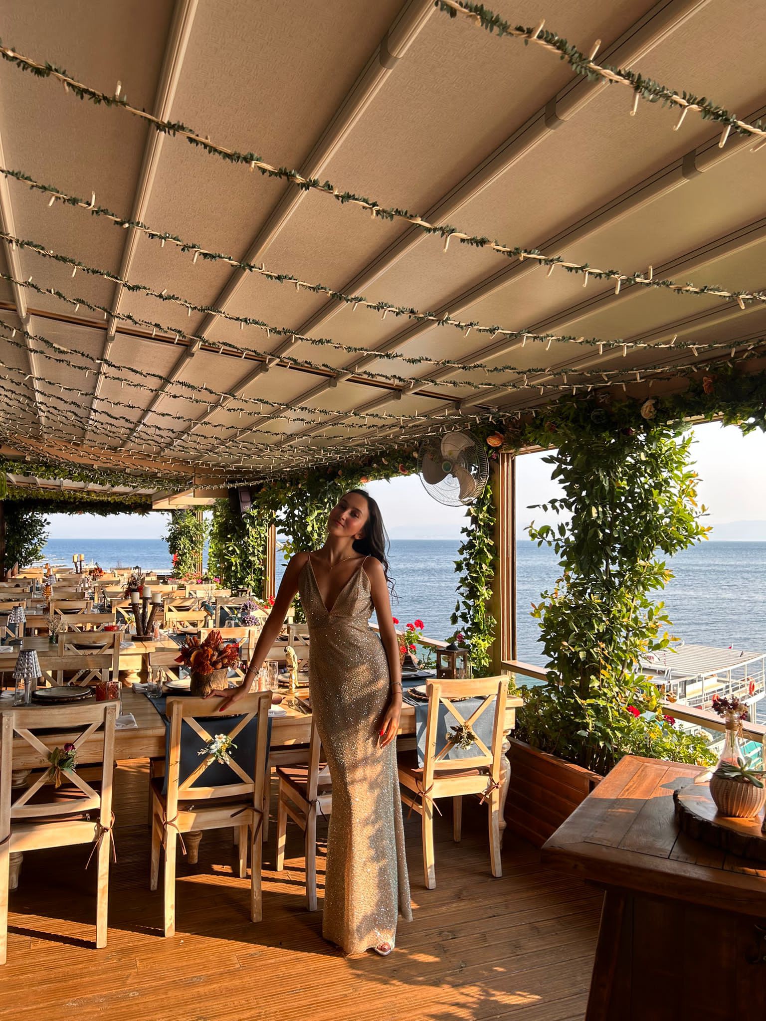 Derin V yaka sırtı açık ince askılı üzeri su yeşili simli uzun gece elbisesi