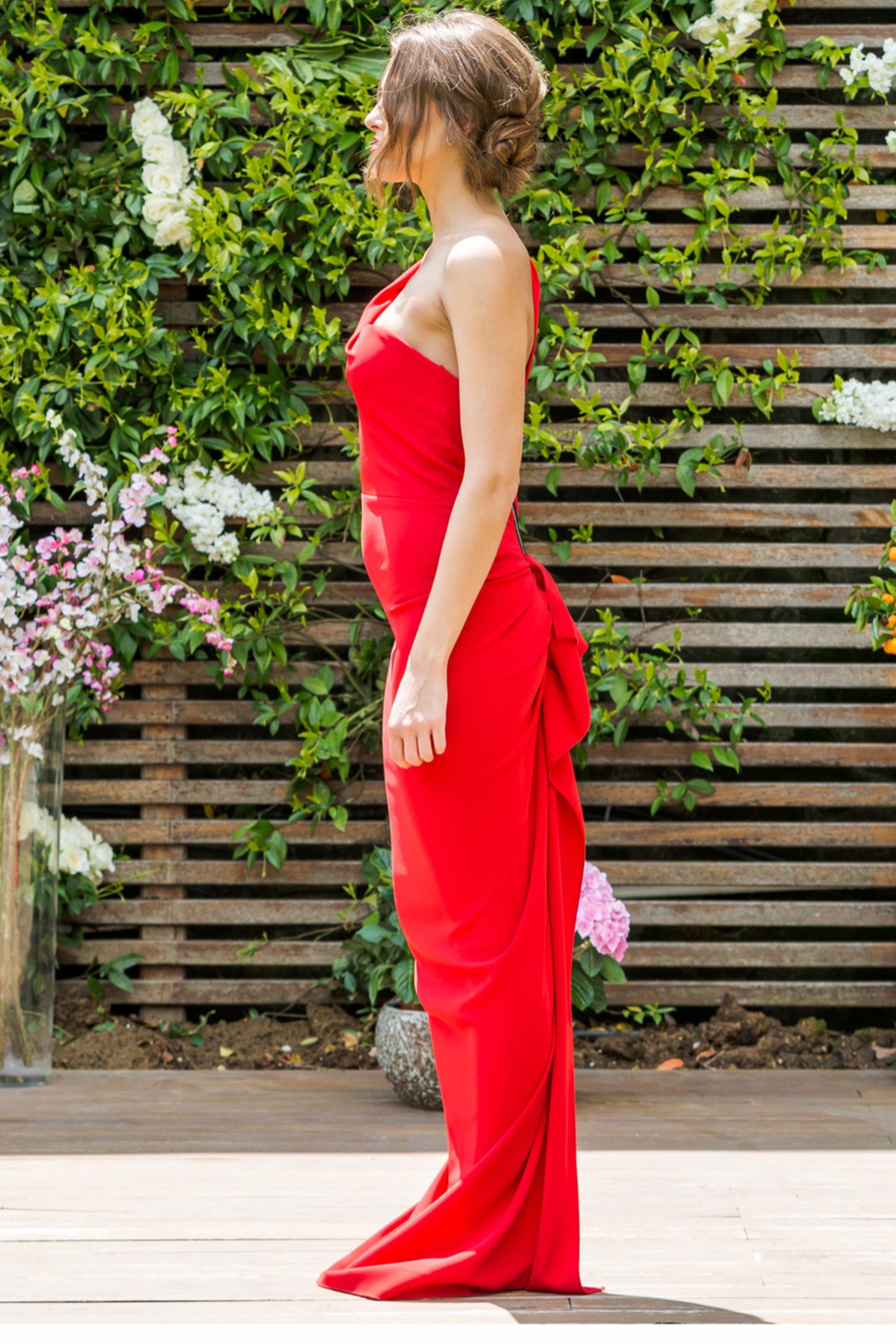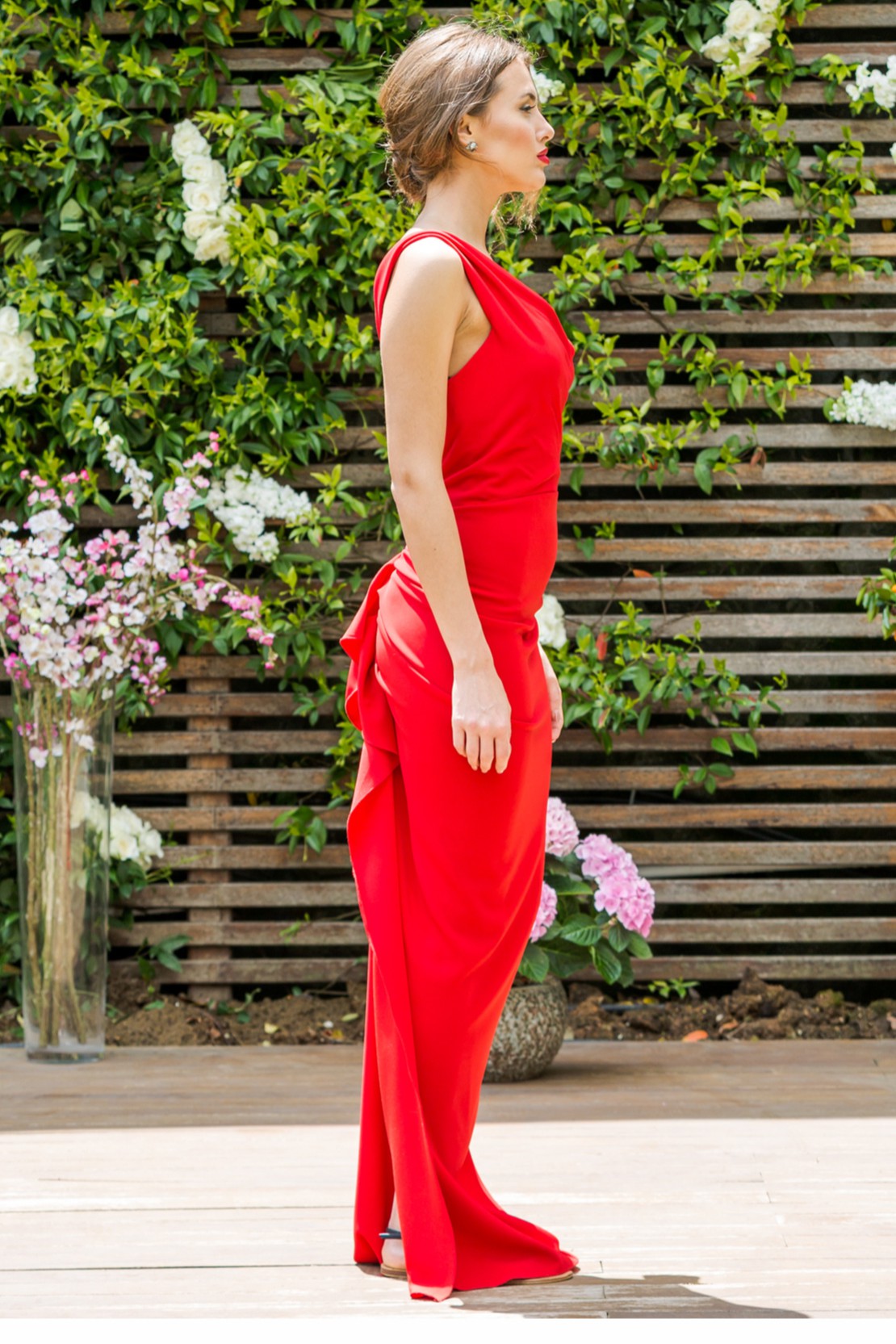 Tek Omuz Arkası Fırfırlı ve Yırtmaçlı Gece Elbisesi