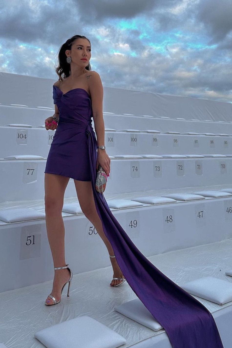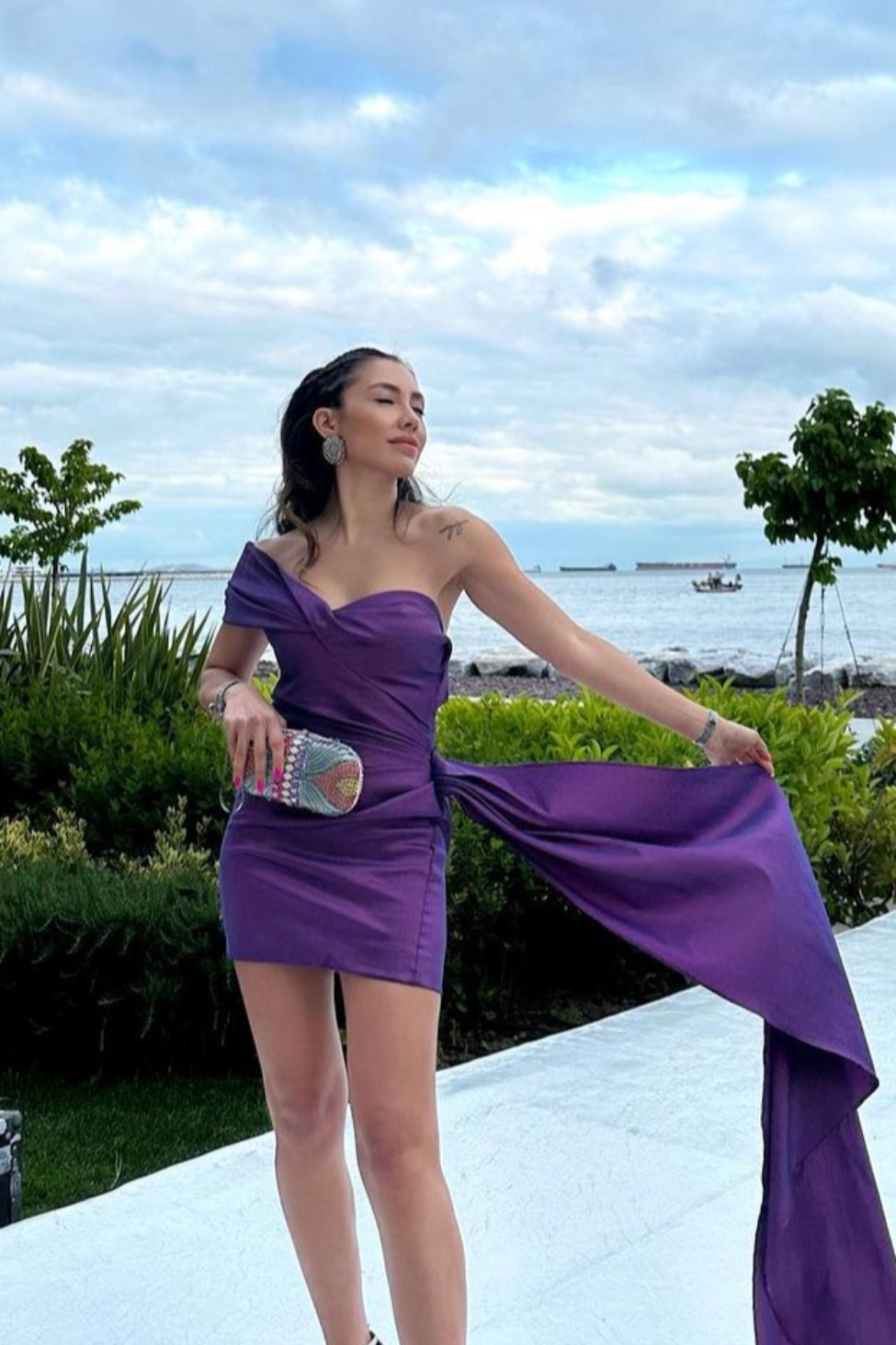 Tek omuz kalp yaka beli drapeli uzun kuşaklı mini kokteyl elbisesi