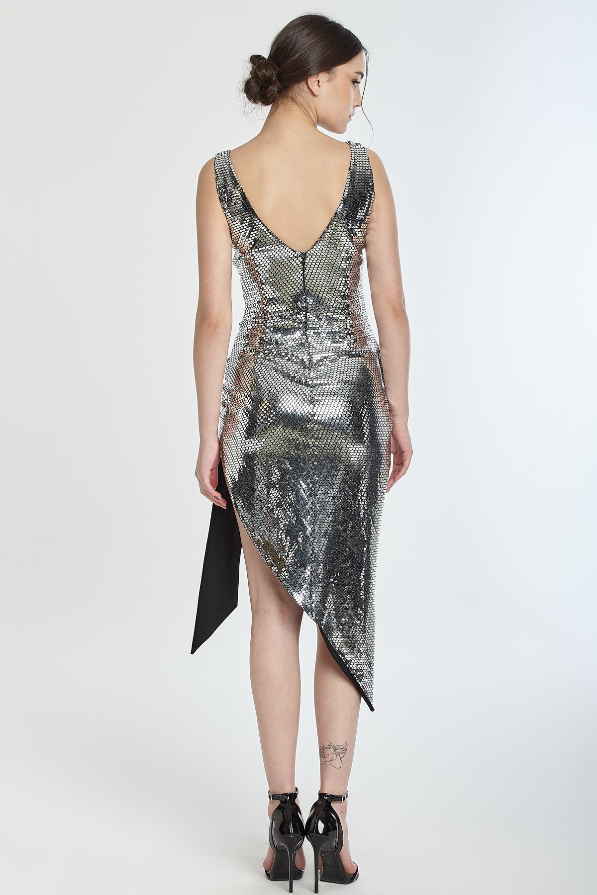 Kalın askılı V yaka asimetrik kesim beli kemer detaylı kokteyl elbisesi