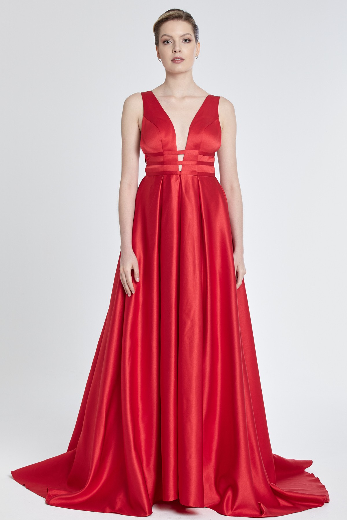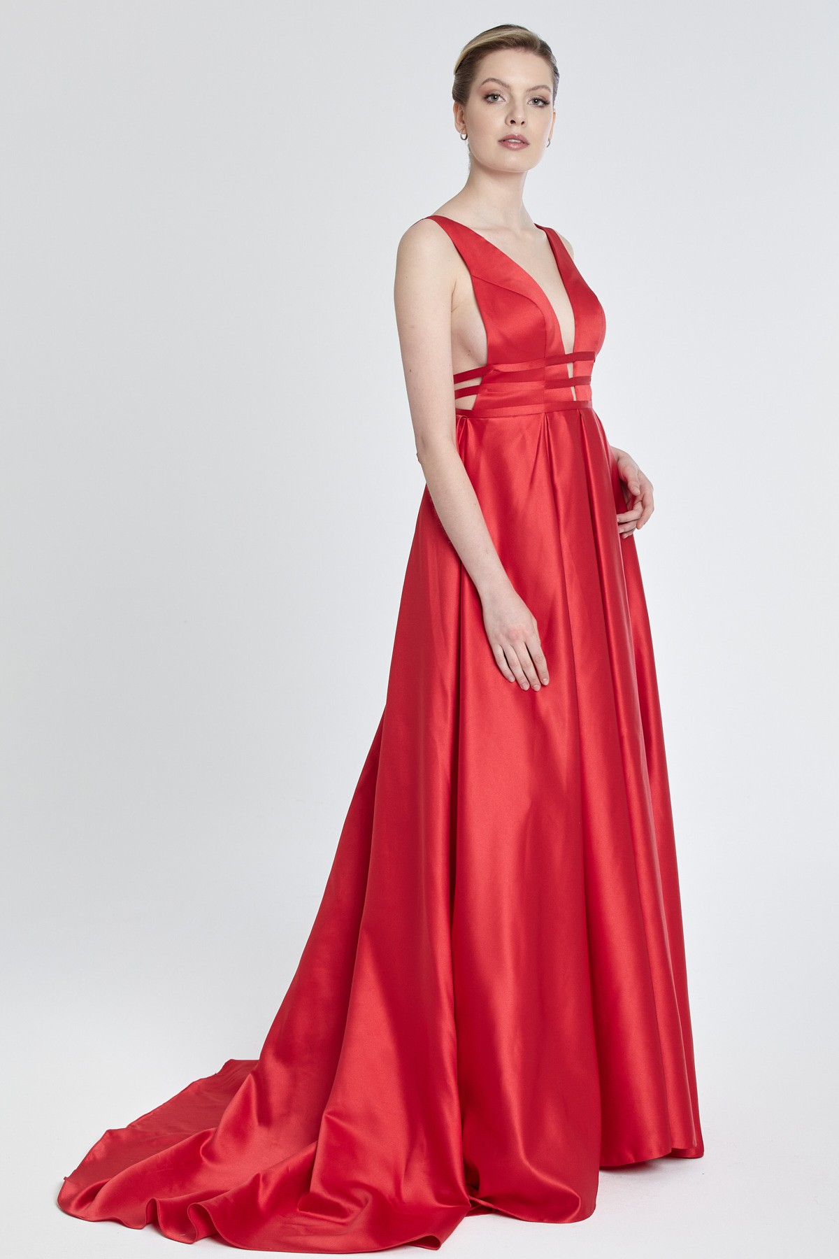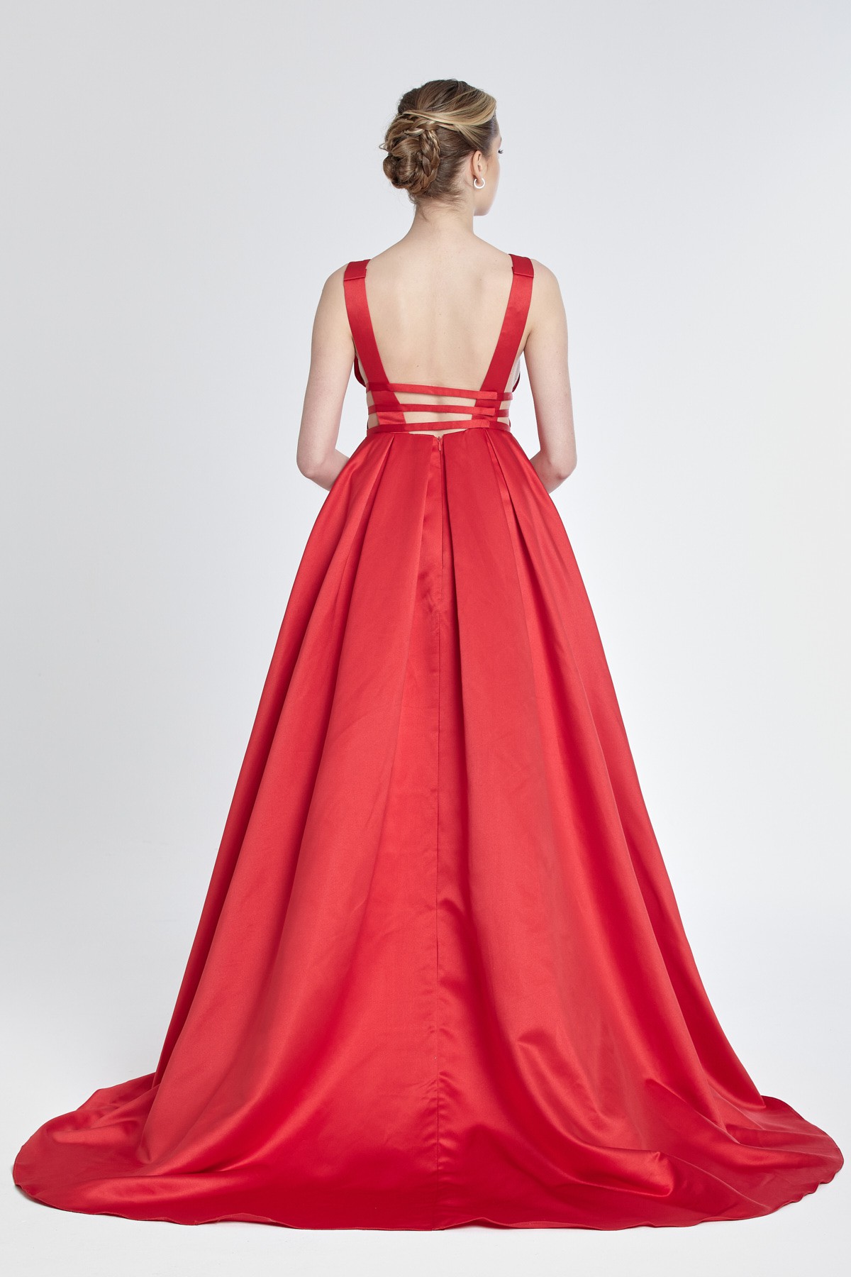 Sırt ve göğüs dekolteli göğüs altında ince üç şeritli kalın askılı kalın saten hafif kabarık kuyruklu gece elbisesi