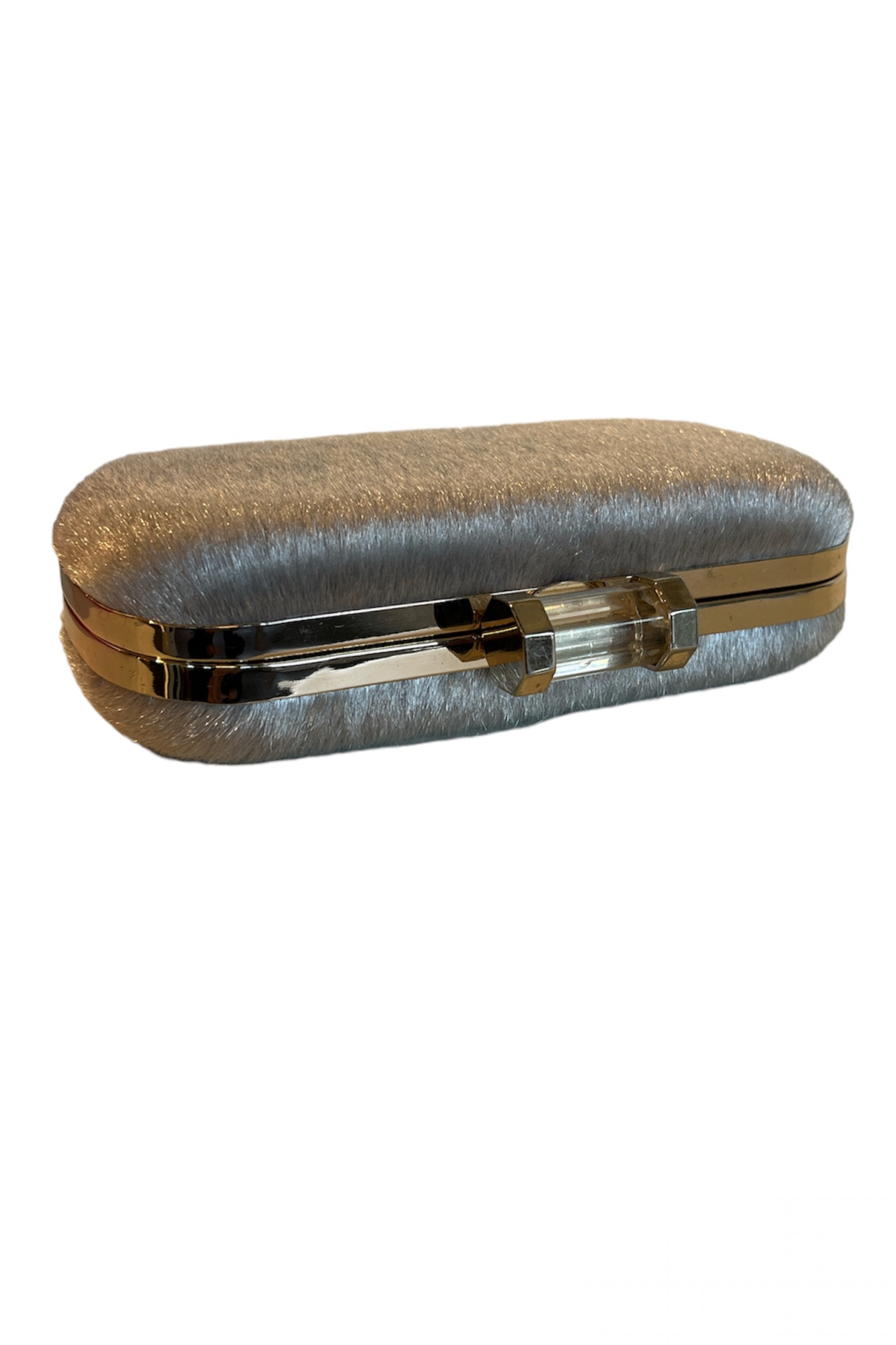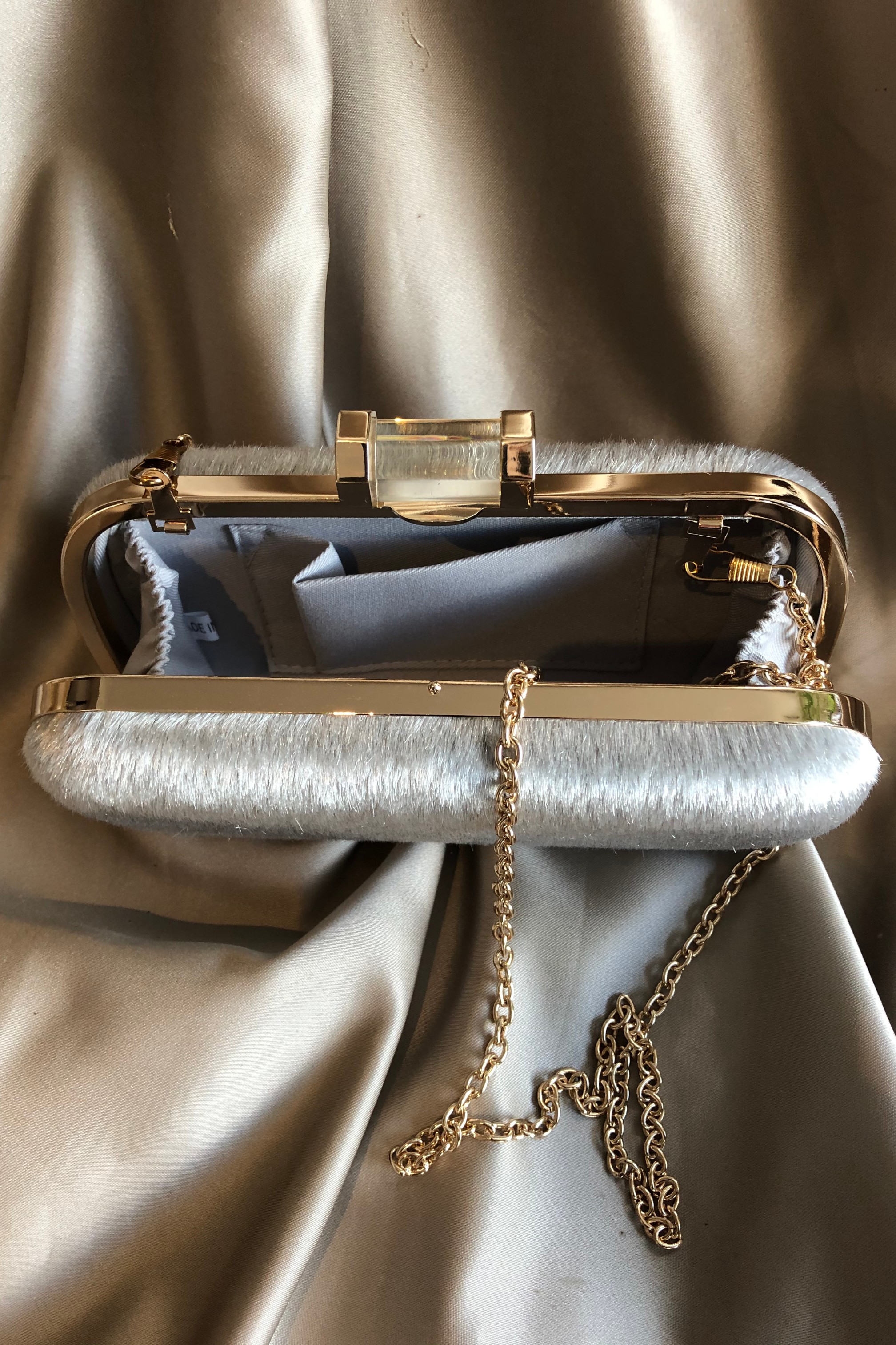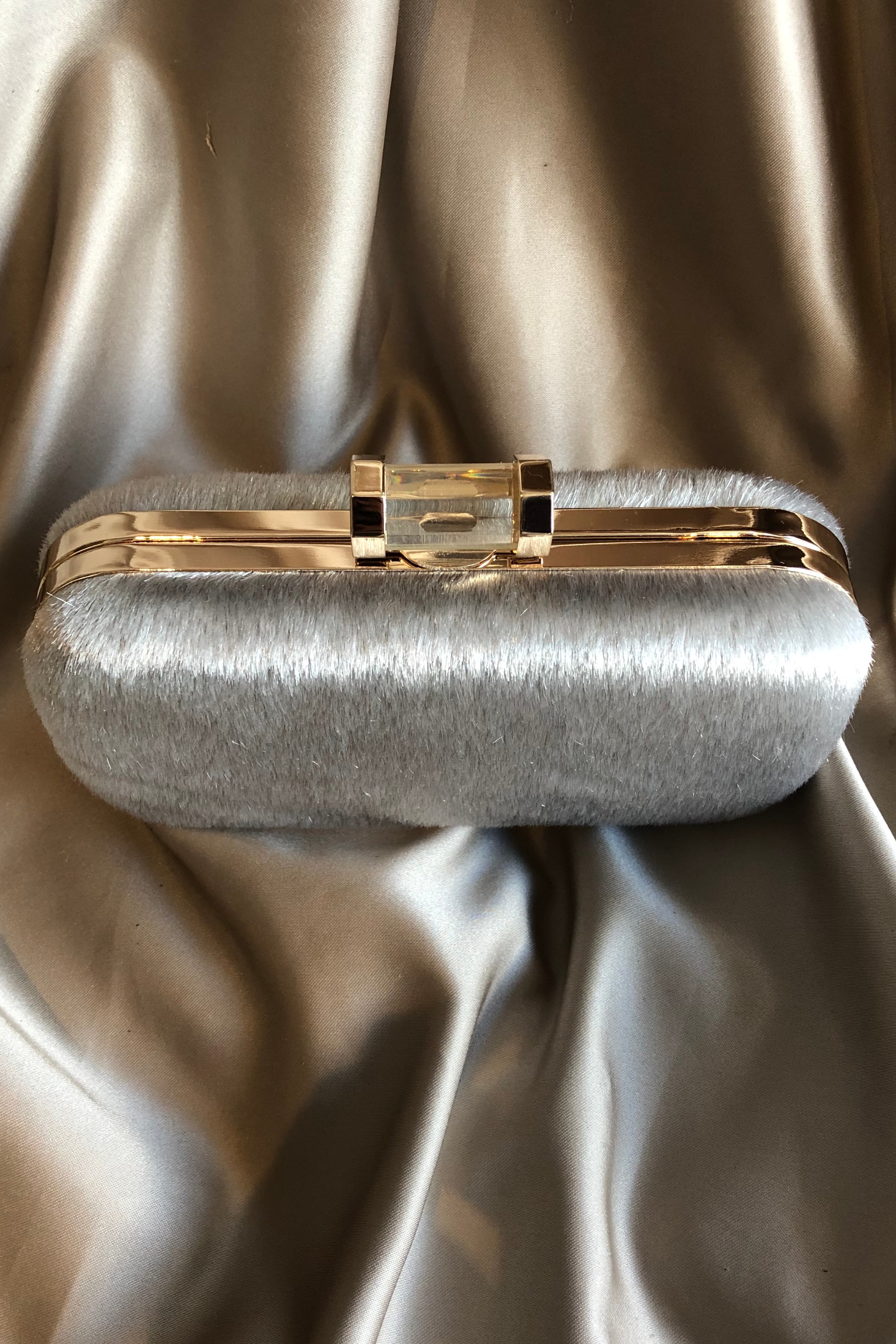 Gri renkli yapay tüylü klipsi şeffaf detaylı zincirlemde kullanılabilen el çantası