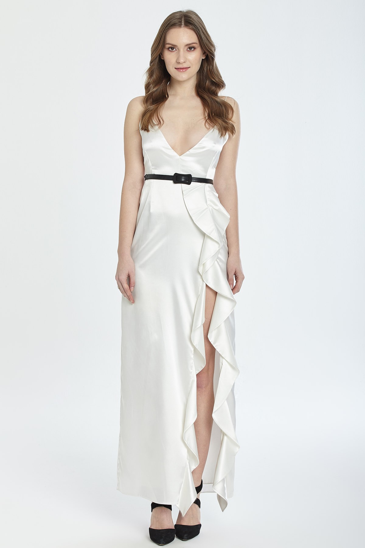 İnce askılı göğüs ve sırt dekolteli derin yırtmaçlı yırtmacı fırfır detaylı saten gece elbisesi