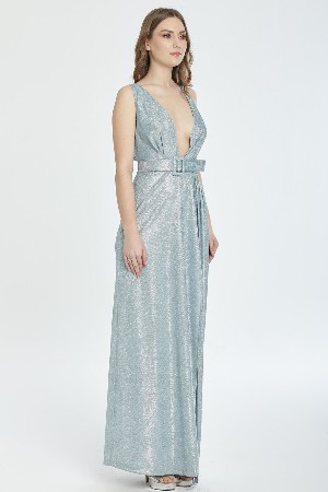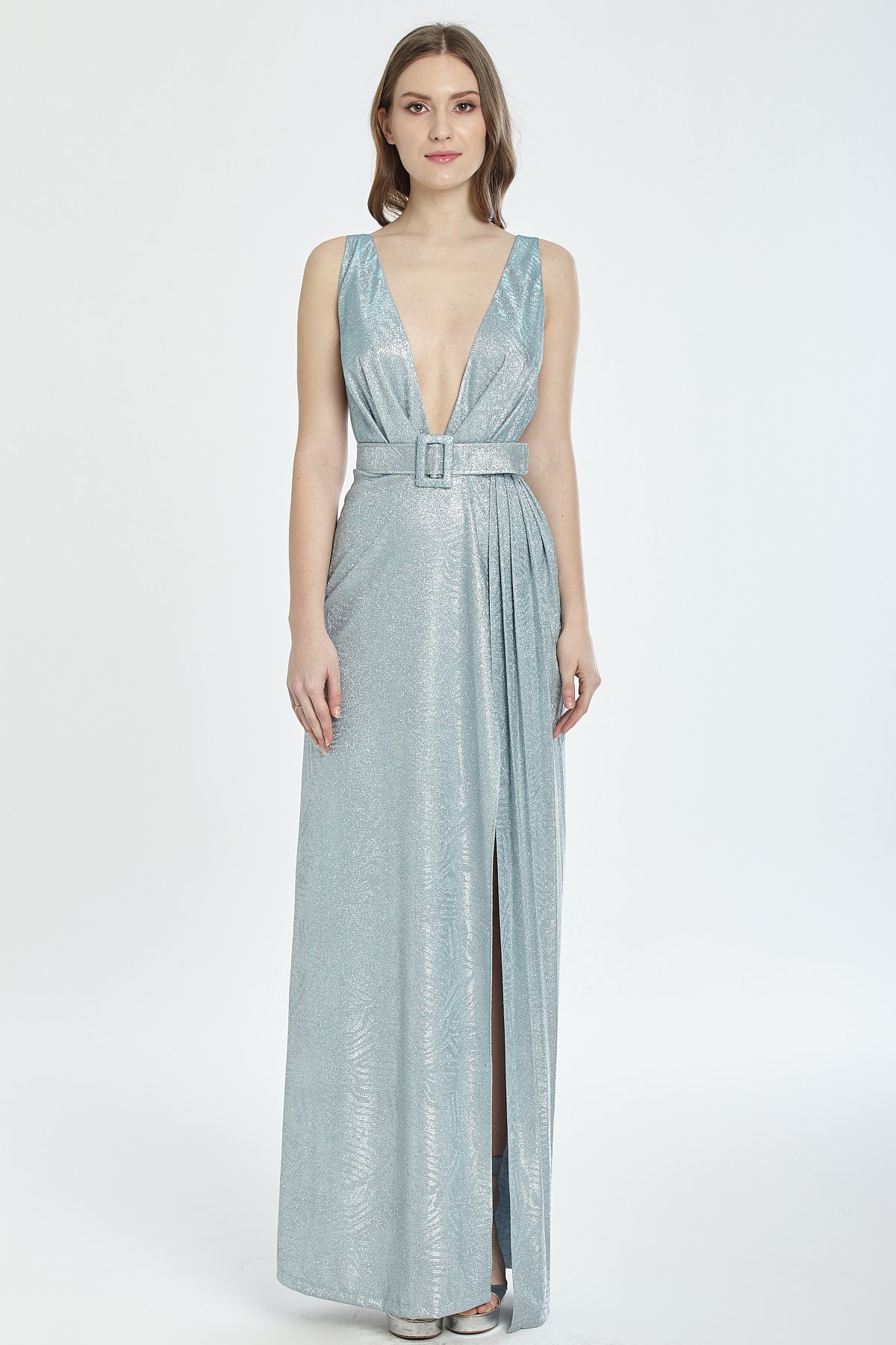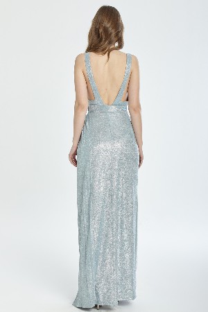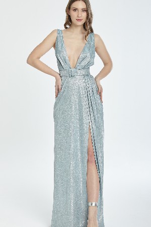 İnce askılı derin göğüs ve sırt dekolteli beli kemerli derin yırtmaçlı kendinden ışıltılı gece elbisesi