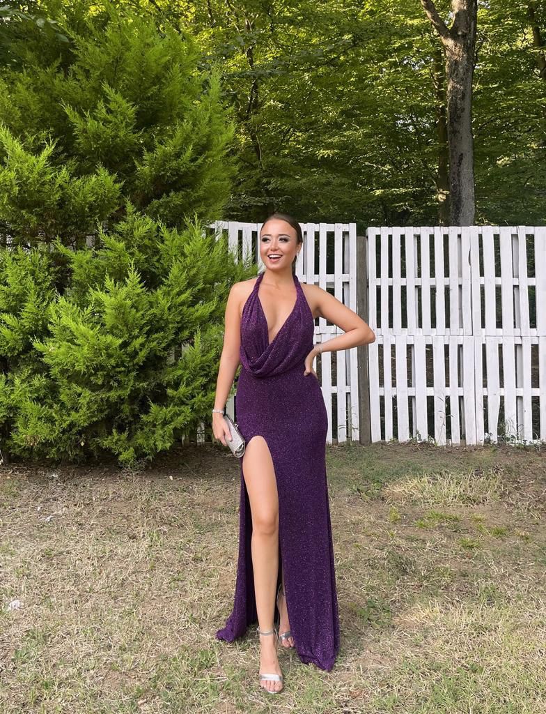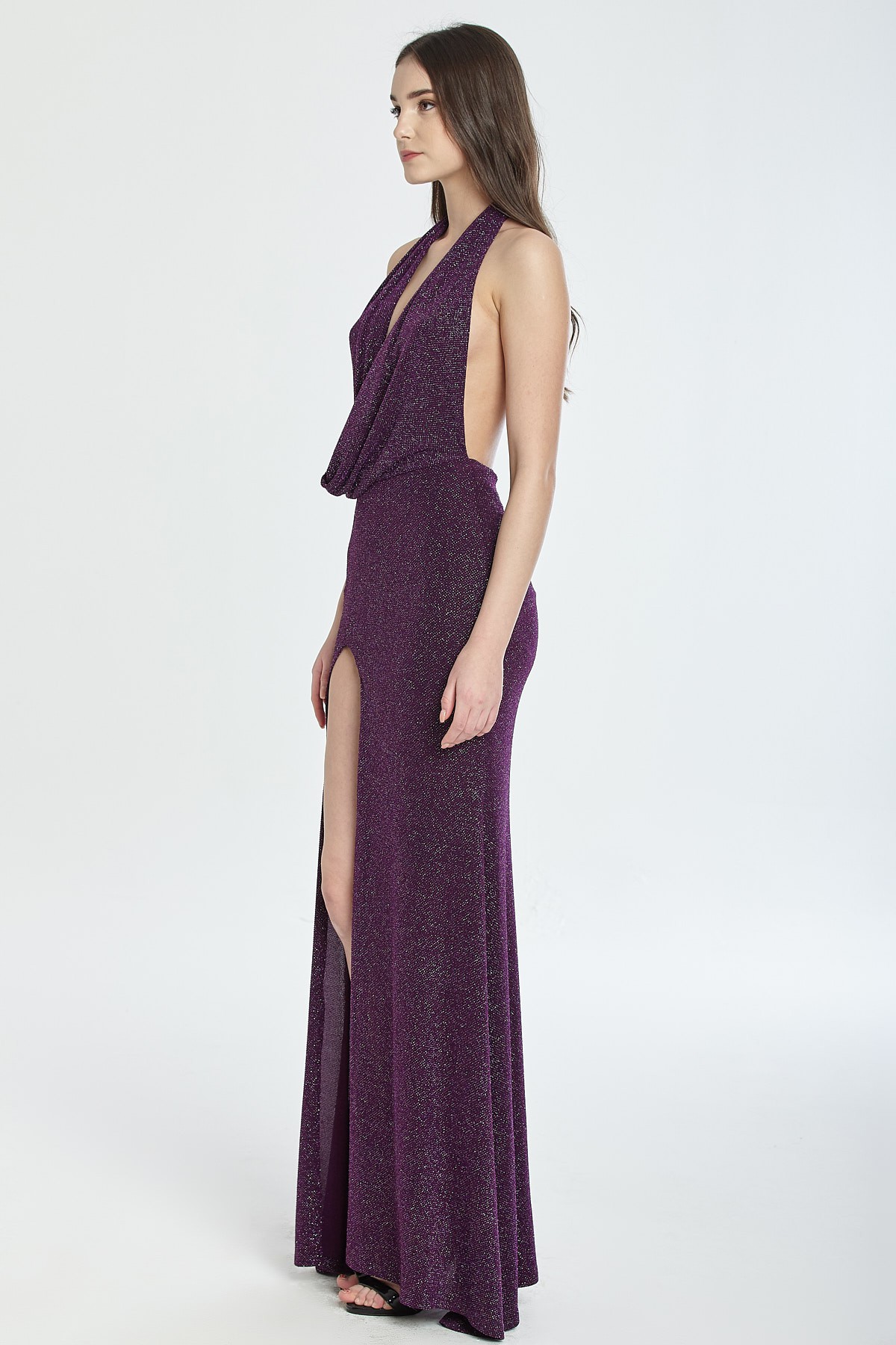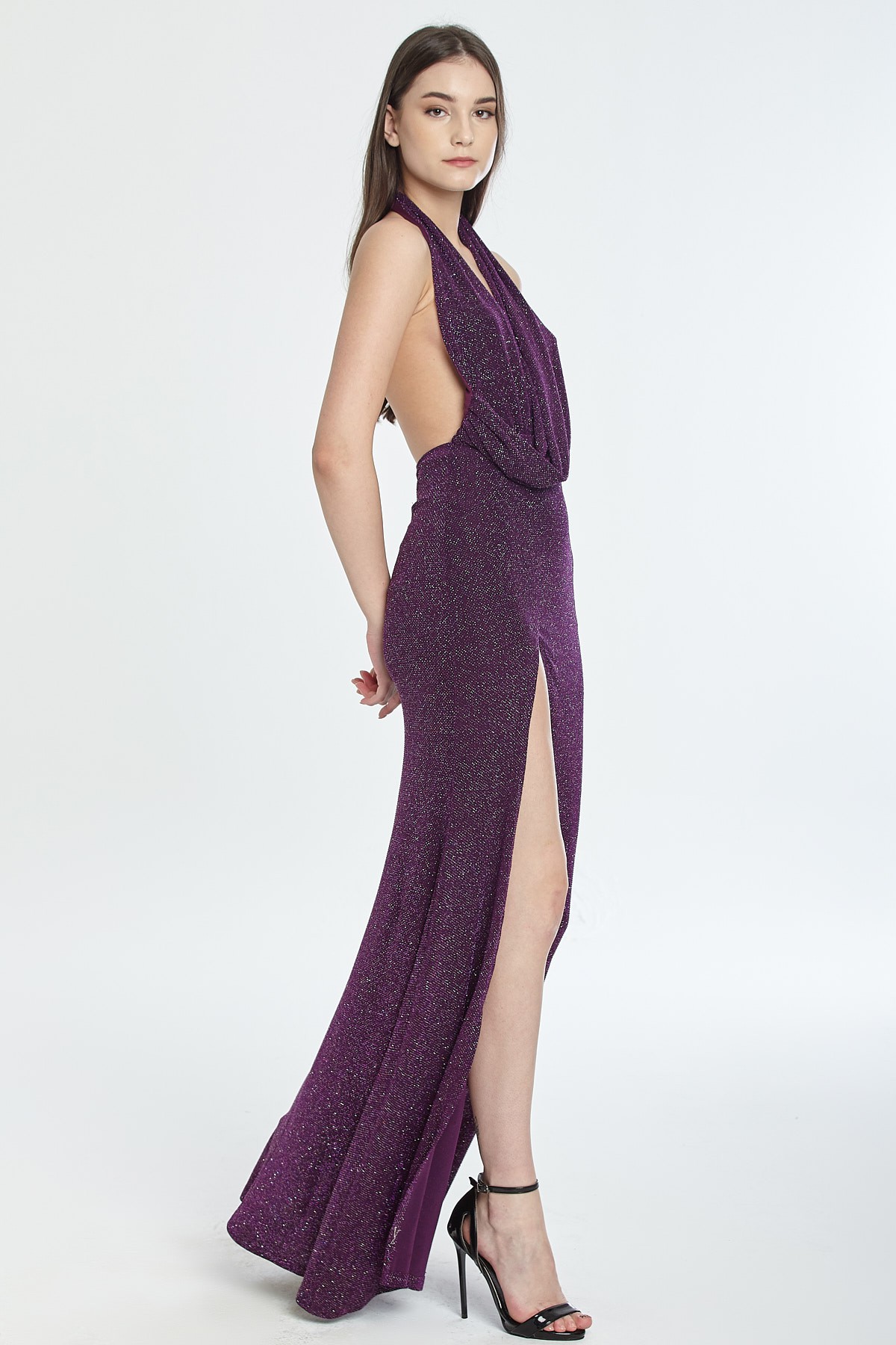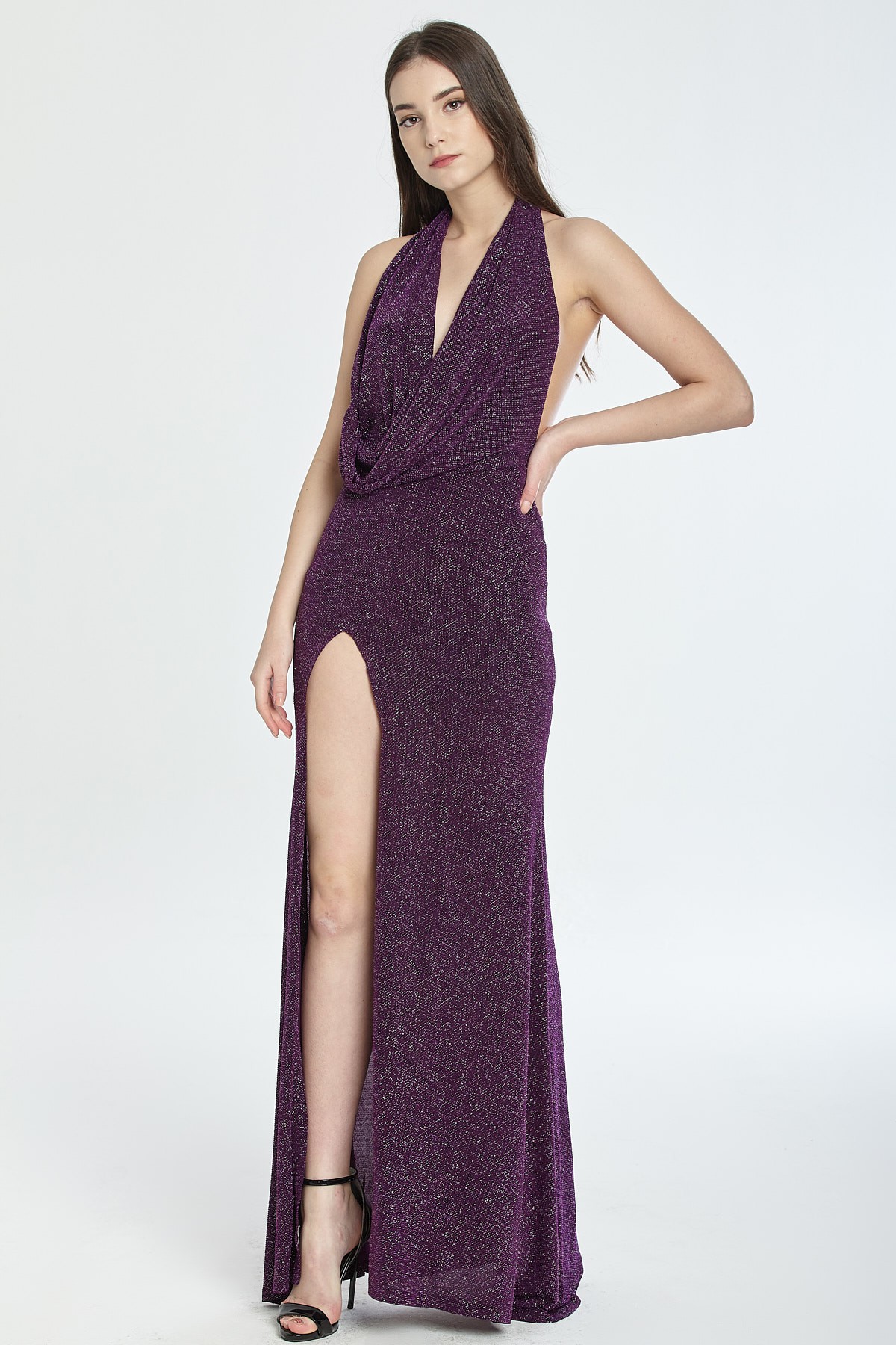 Boyundan bağlama göğsü dökümlü derin sırt dekolteli yırtmaçlı kendinden ışıltılı gece elbisesi