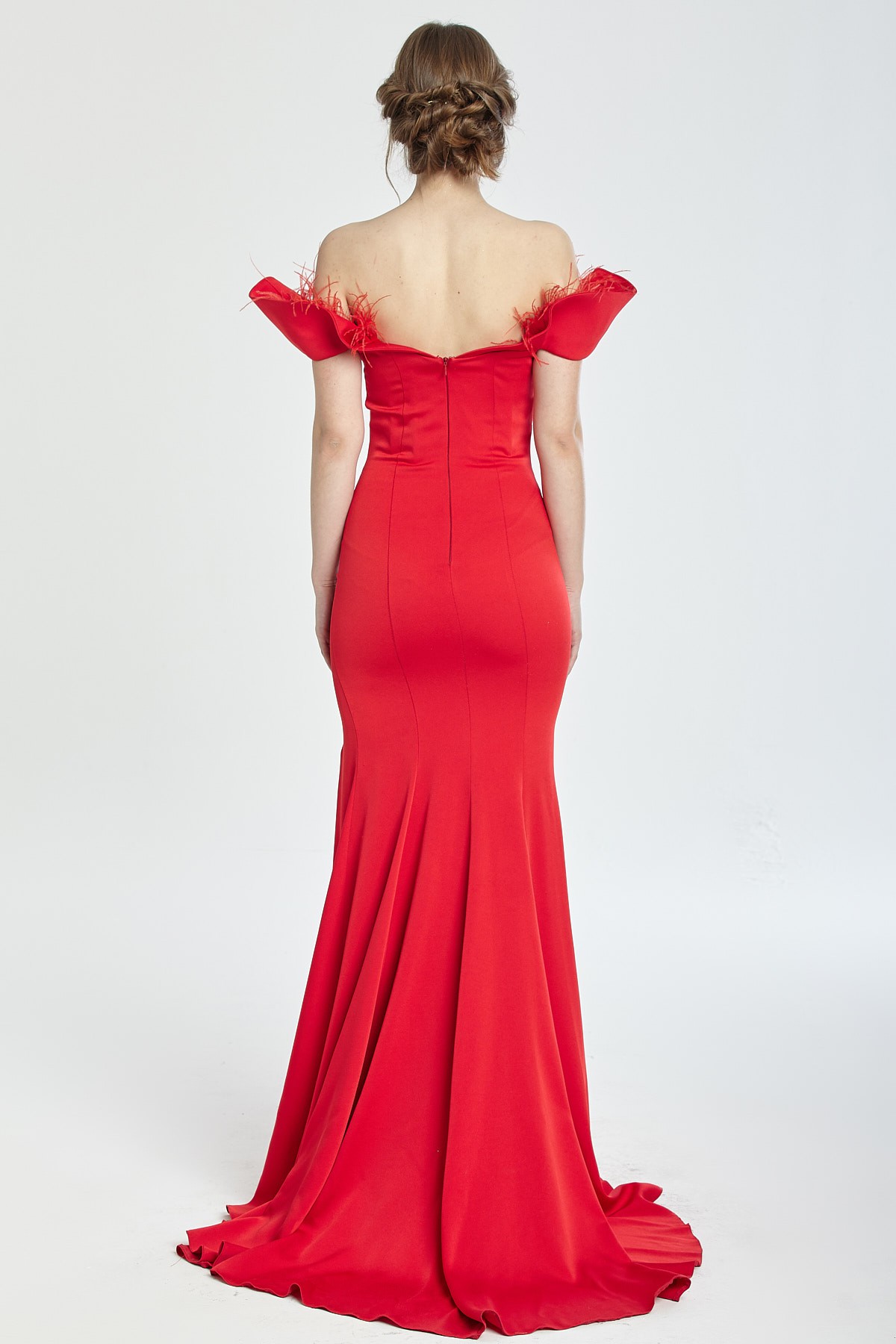 Kayık yaka göğsü tüy detaylı derin yırtmaçlı kuyruklu gece elbisesi