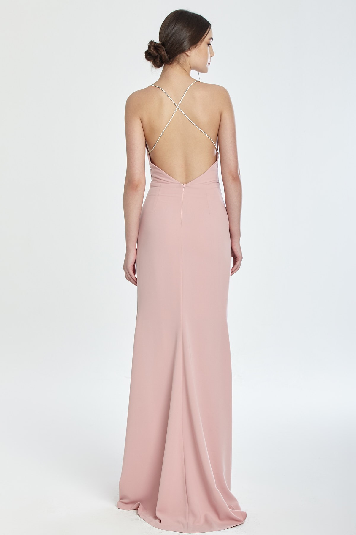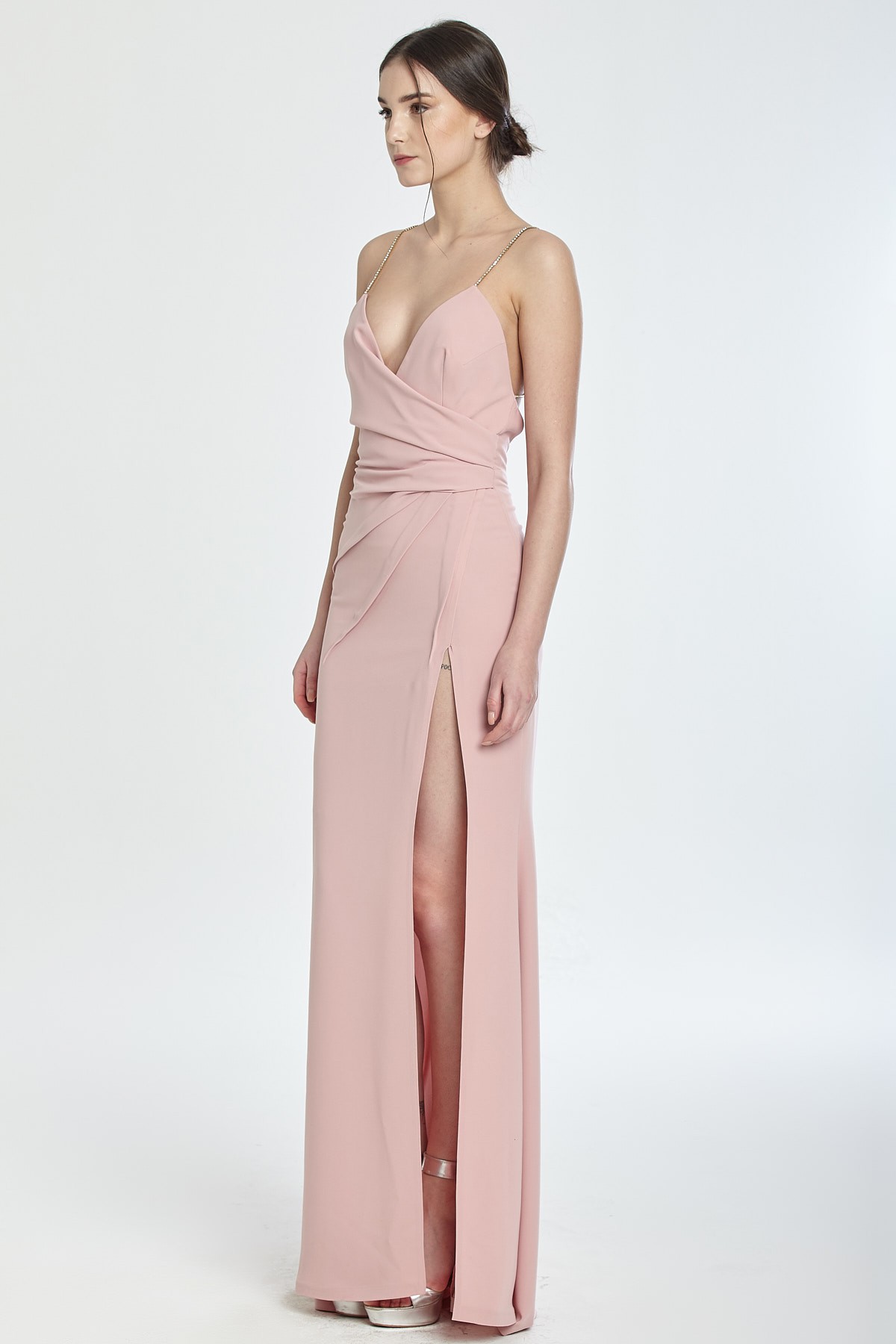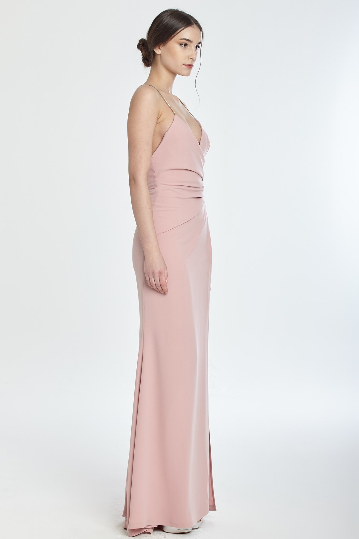 İnce taş askılı derin göğüs ve çarpraz sırt dekolteli beli drapeli derin yırtmaçlı kuyruklu gece elbisesi