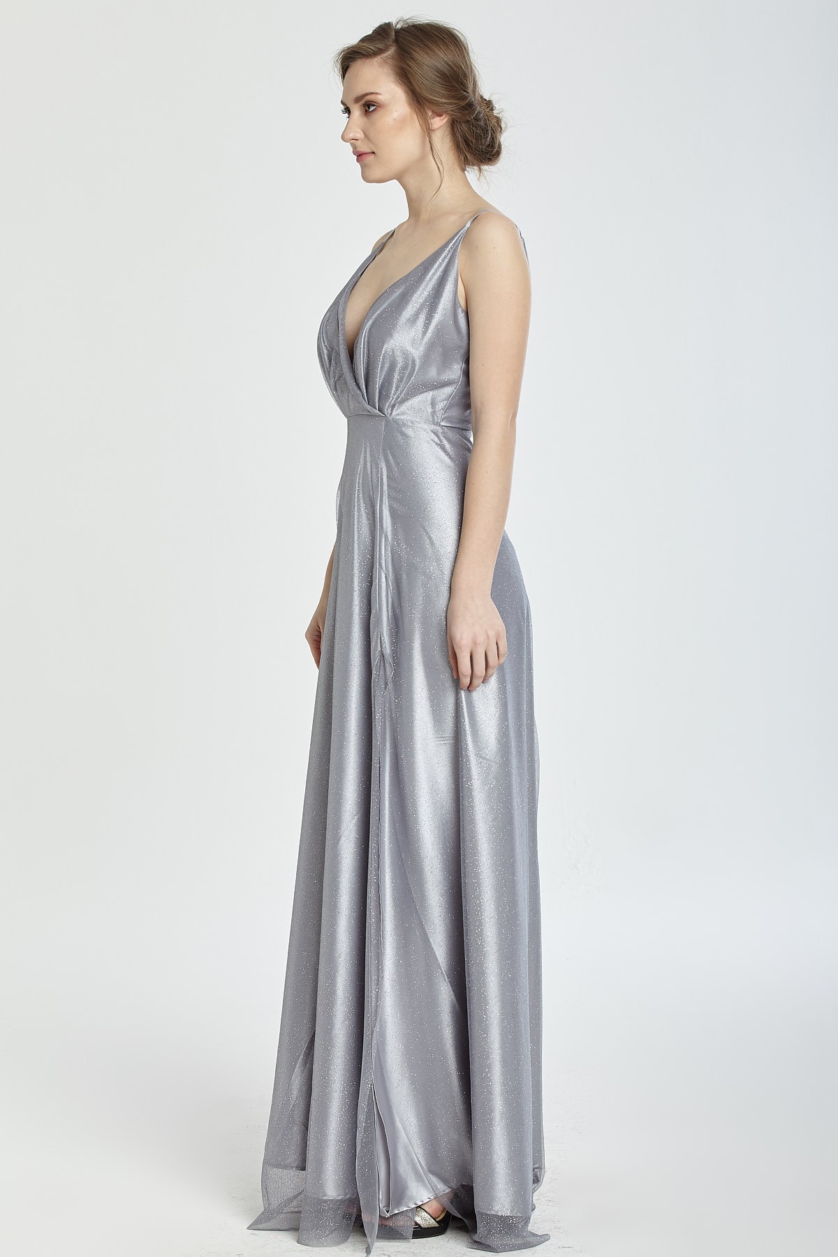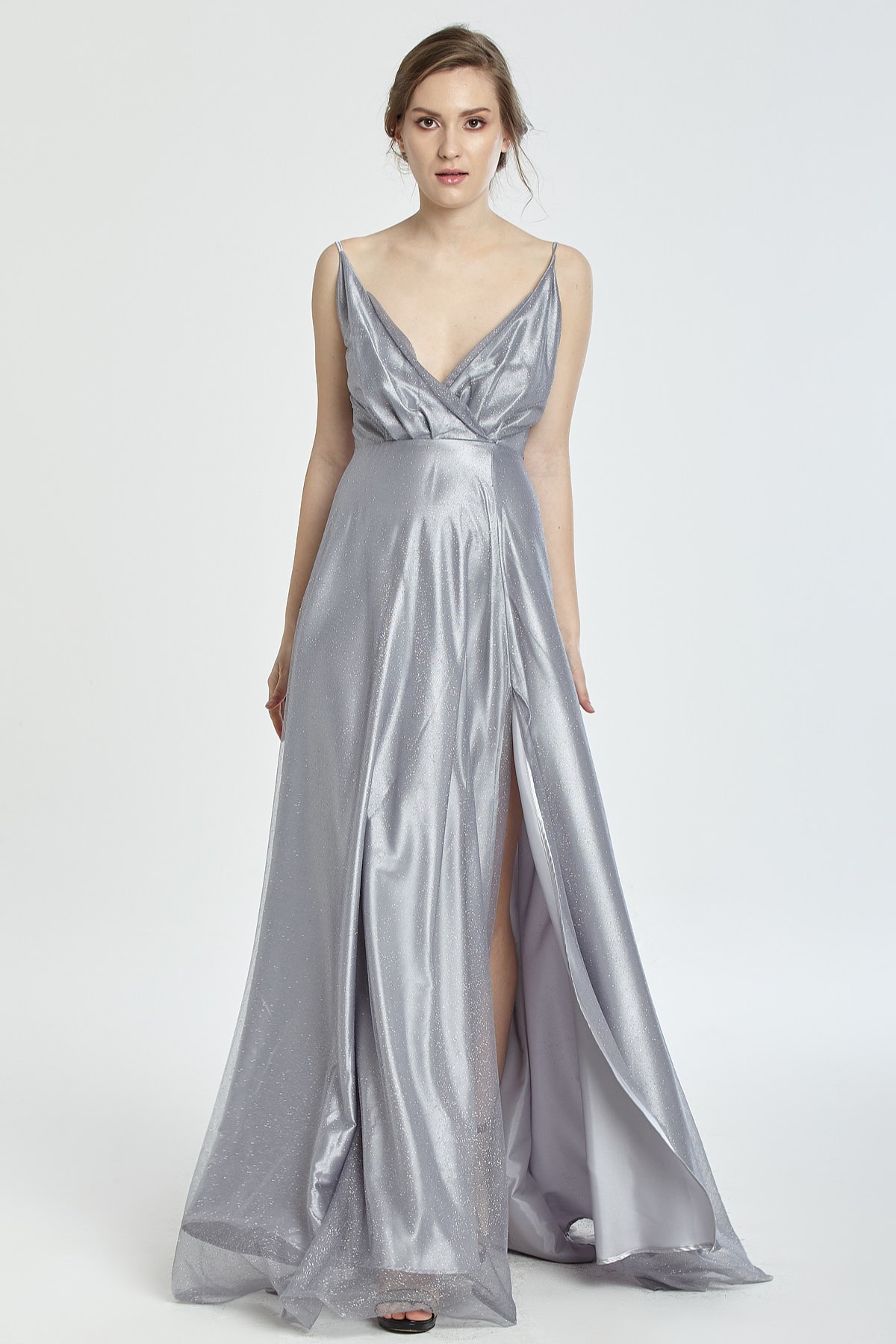 İnce askılı göğüs ve sırt dekolteli A kesim kendinden ışıltılı yırtmaçlı gece elbisesi