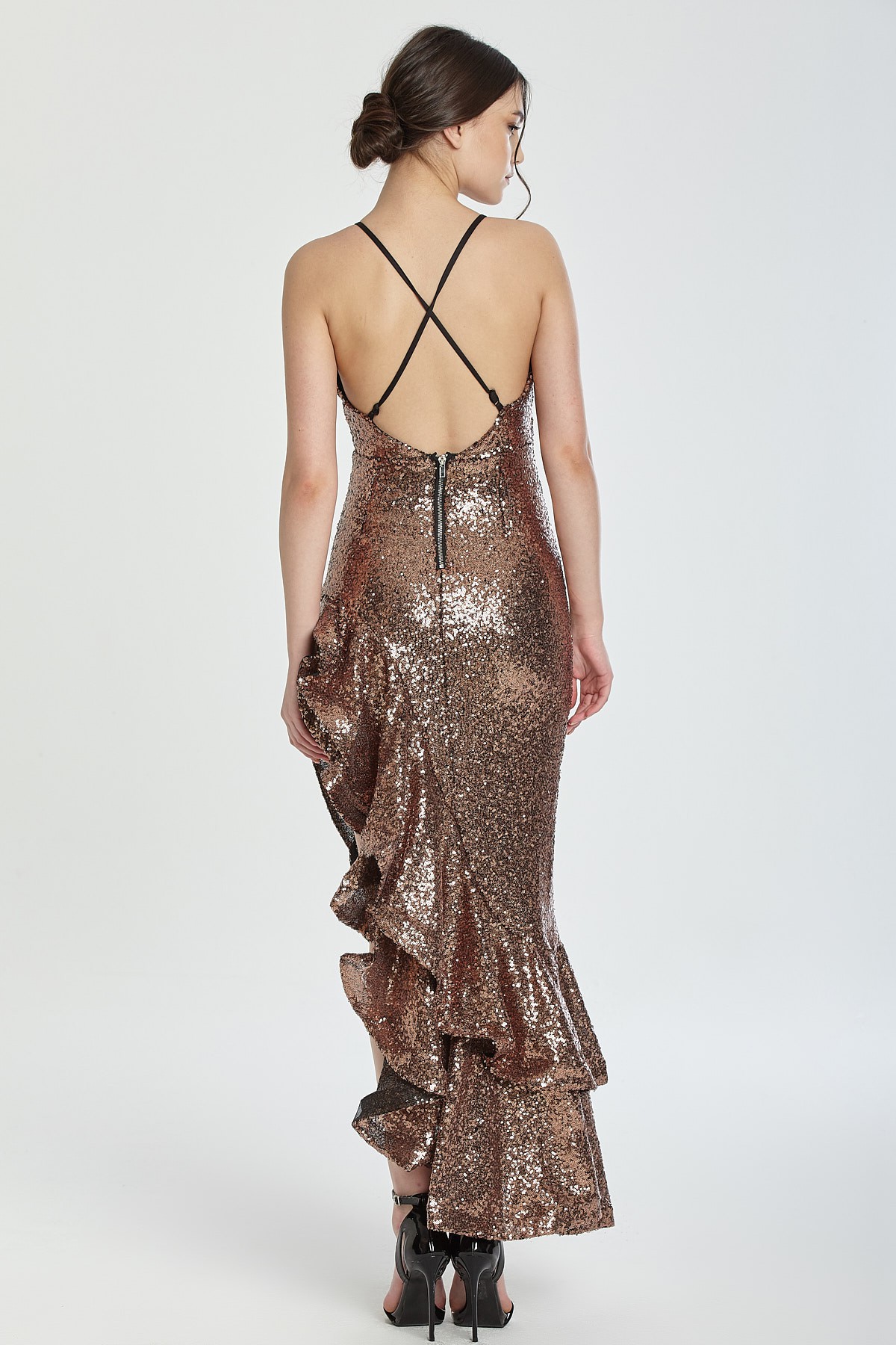 İnce askılı sırtı çarpraz ince askı detaylı derin dekolteli asimetrik kesim etekli etekleri volanlı payetli gece elbisesi