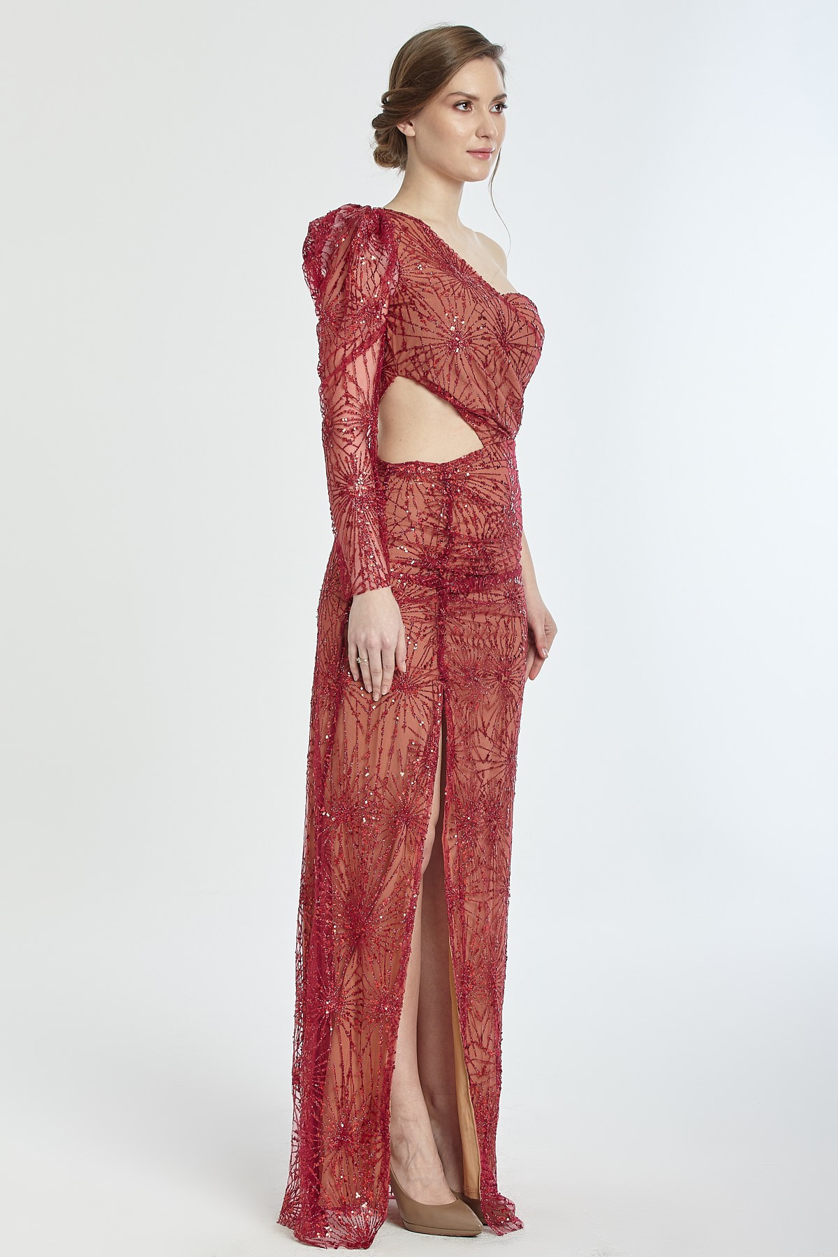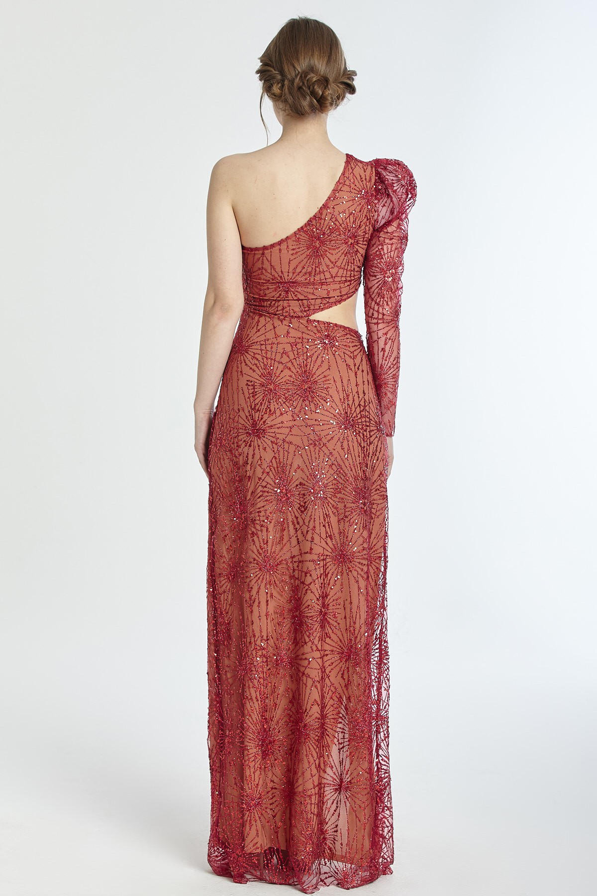 Tek omuz bel dekolteli derin yırtmaçlı kendinden ışıltılı gece elbisesi