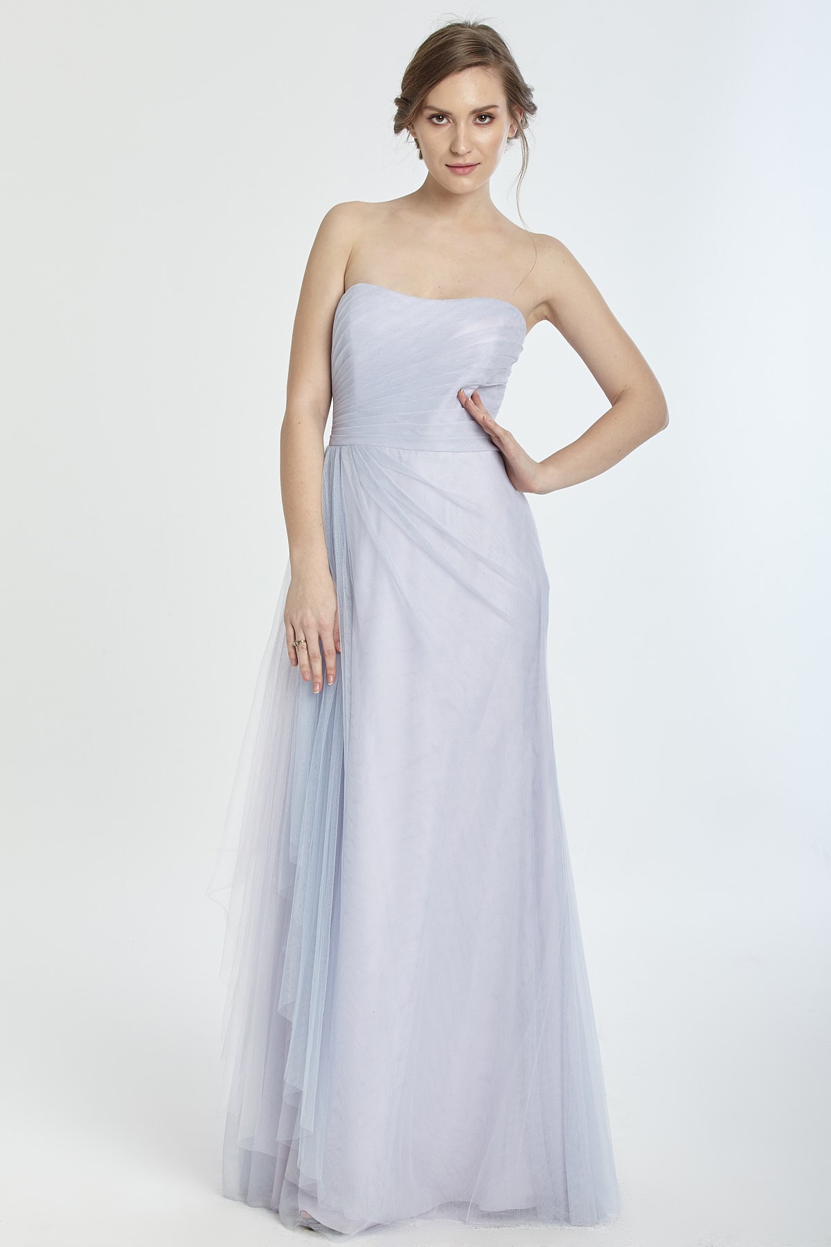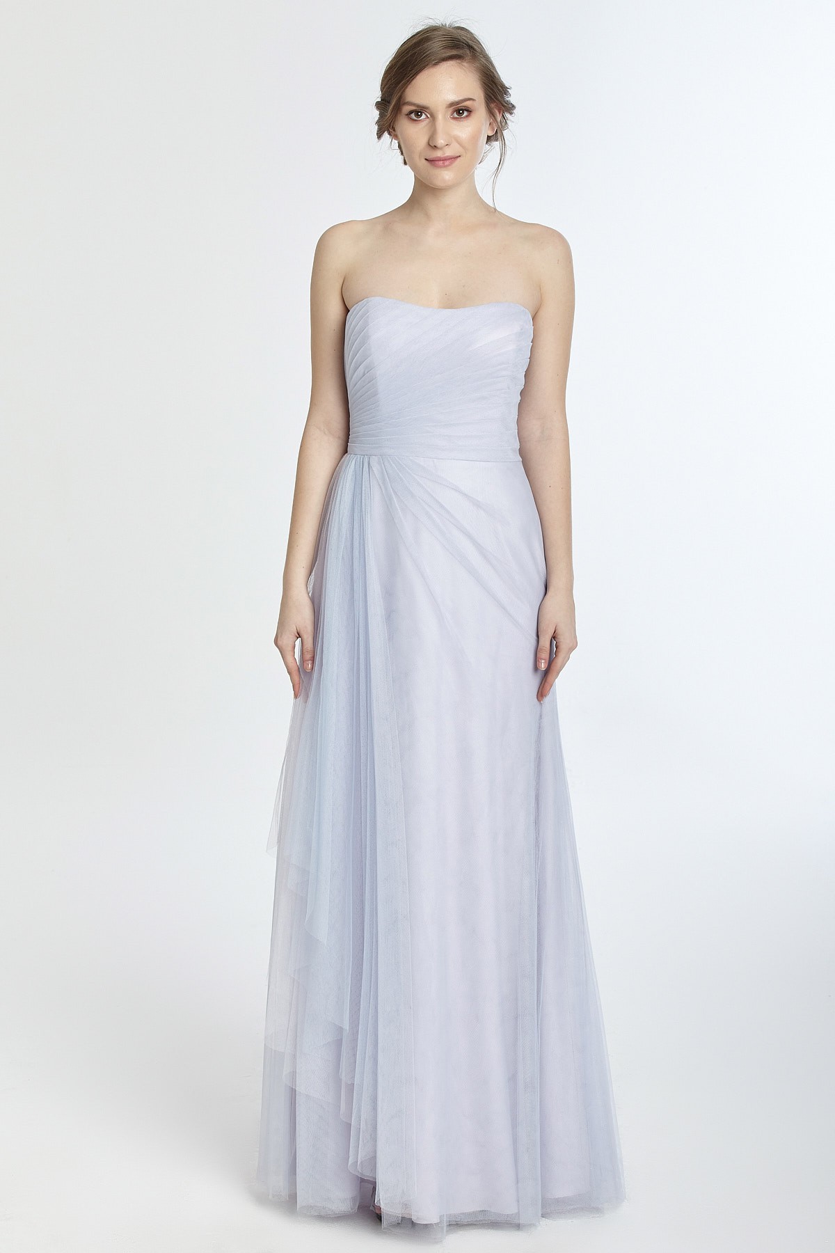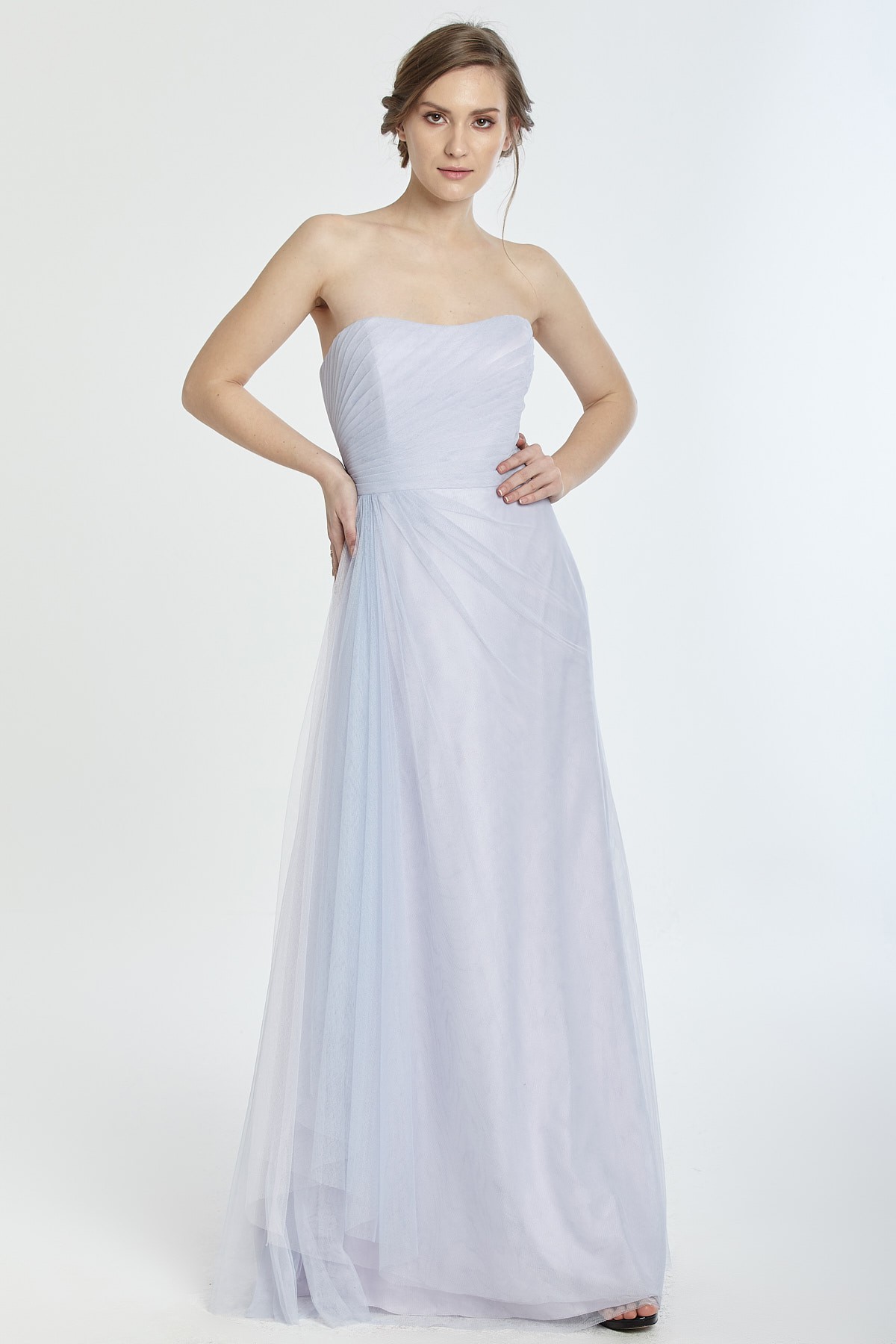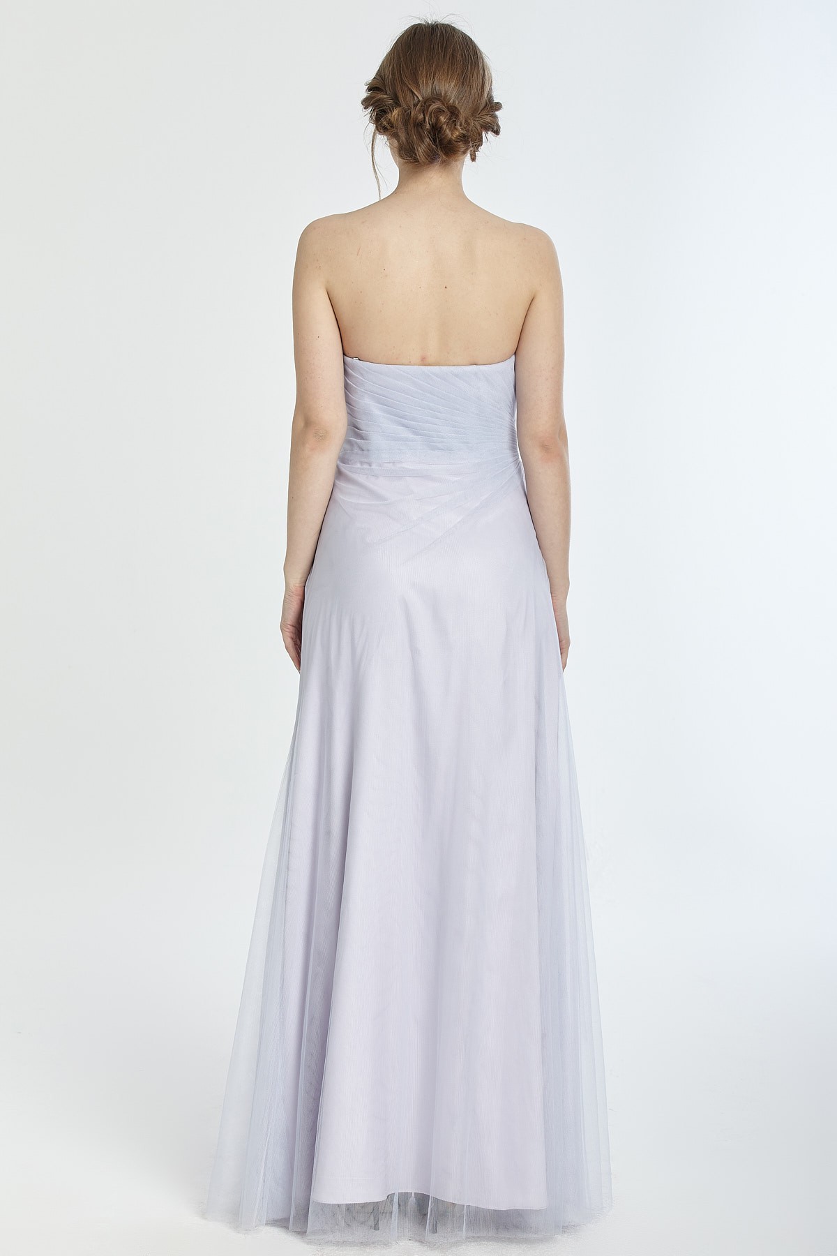 Straplez beli drapeli A kesim tül gece elbisesi