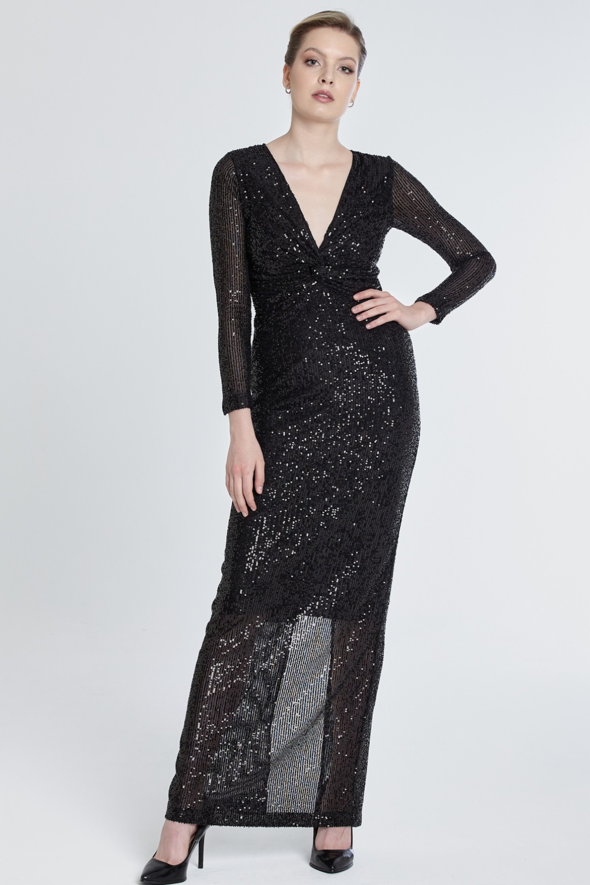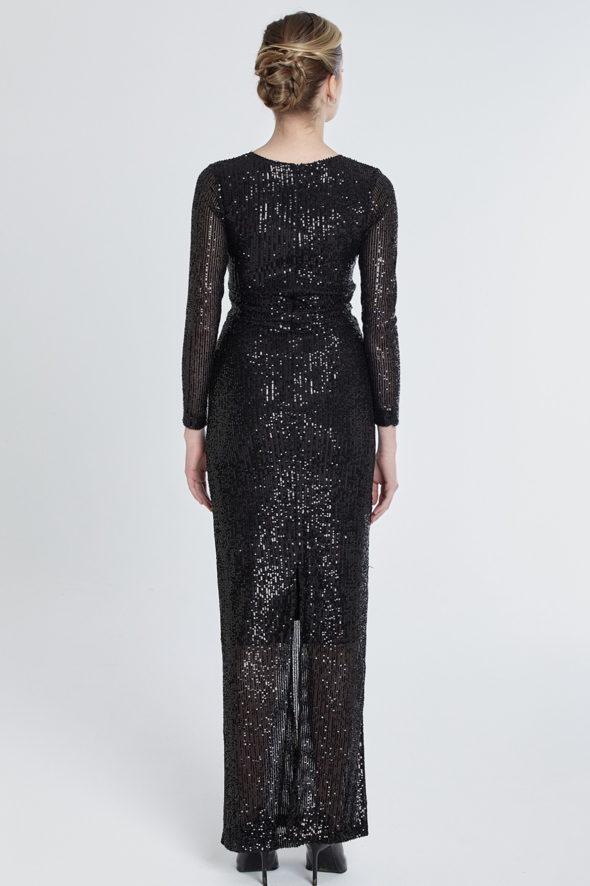 Uzun kollu payetli V yaka göğüs altında düğüm detaylı arkadan yırtmaçlı uzun gece elbisesi