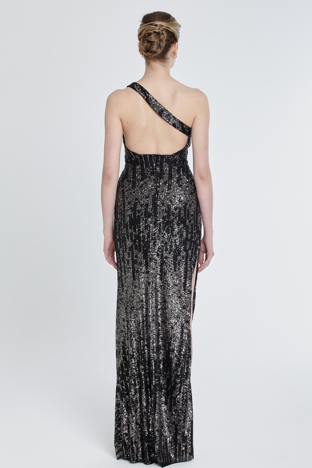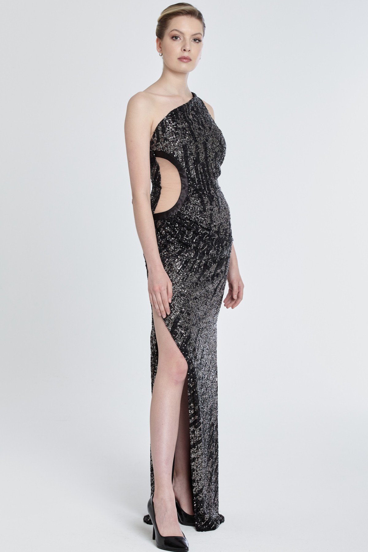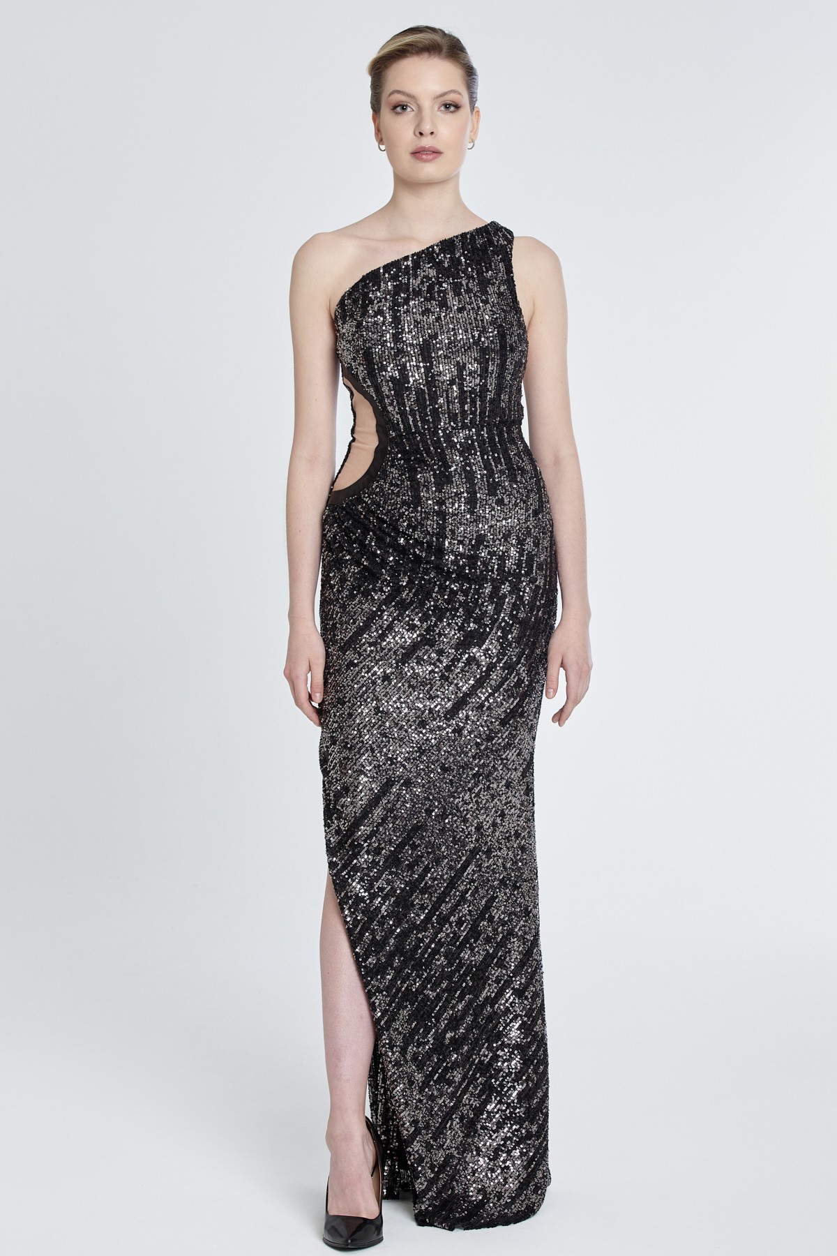 Tek omuz sırtı açık yandan derin yırtmaçlı belinde pencere detaylı uzun gece elbisesi