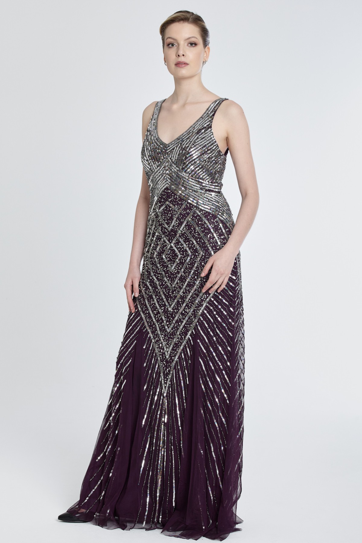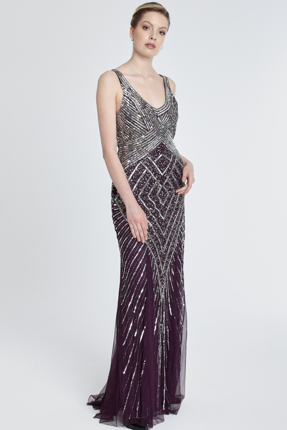 V yaka bocuk ve payet işlemeli sırtı V kesim açık etekleri tül gece elbisesi