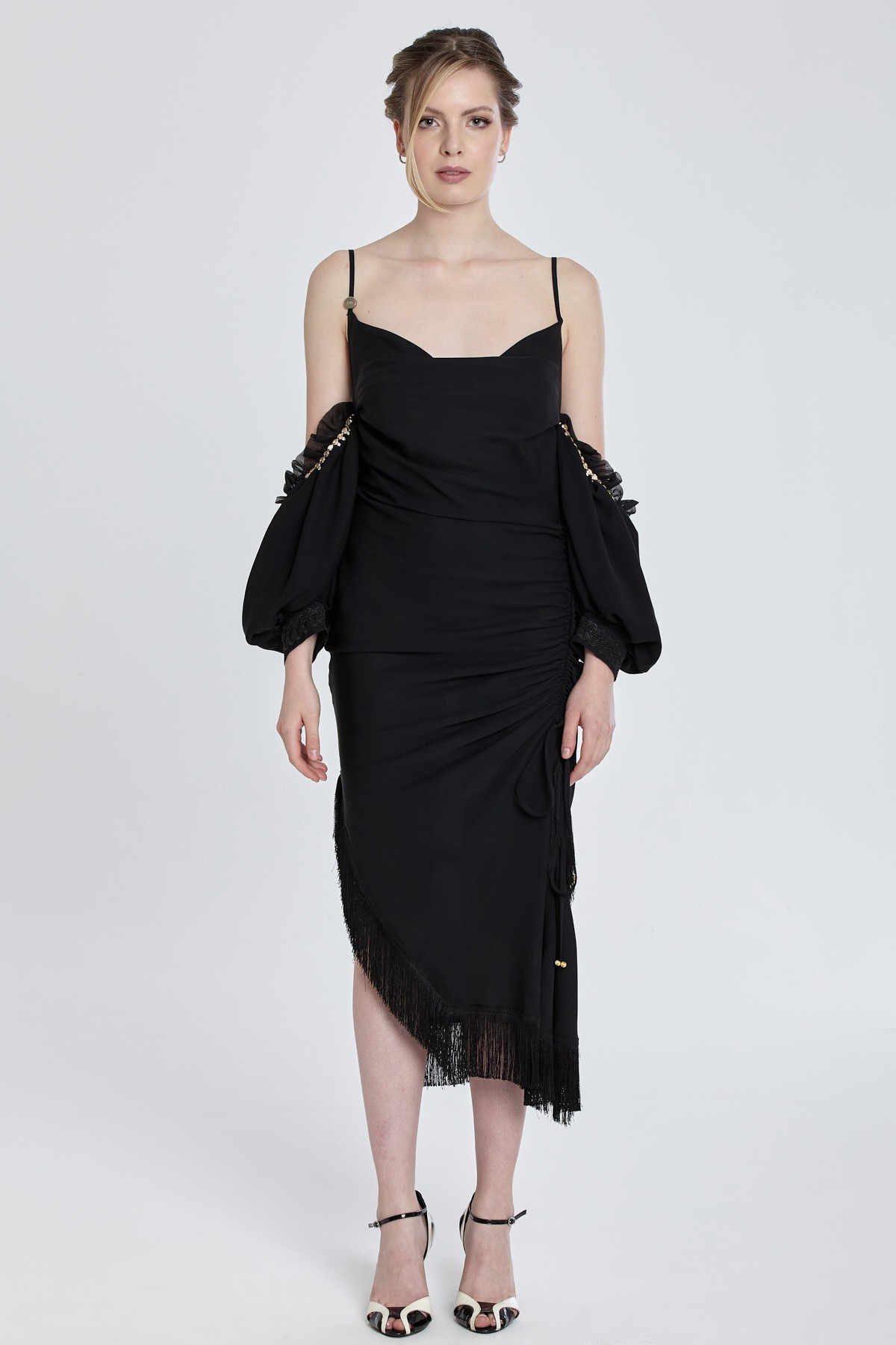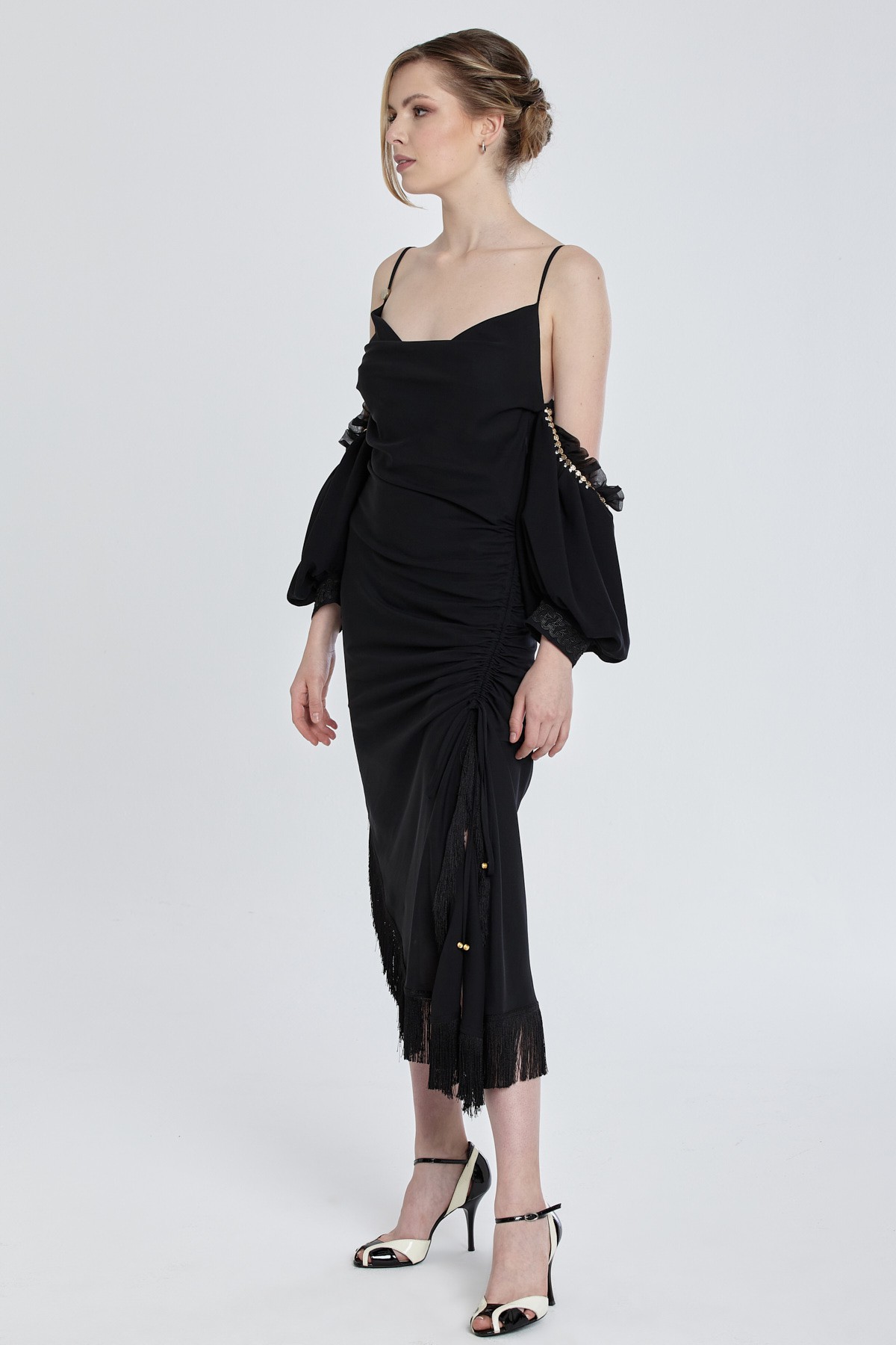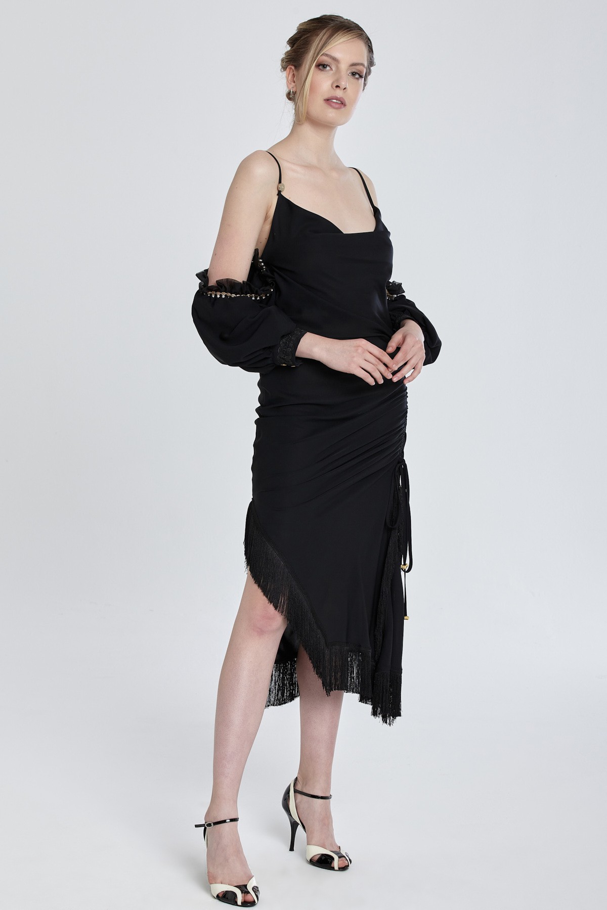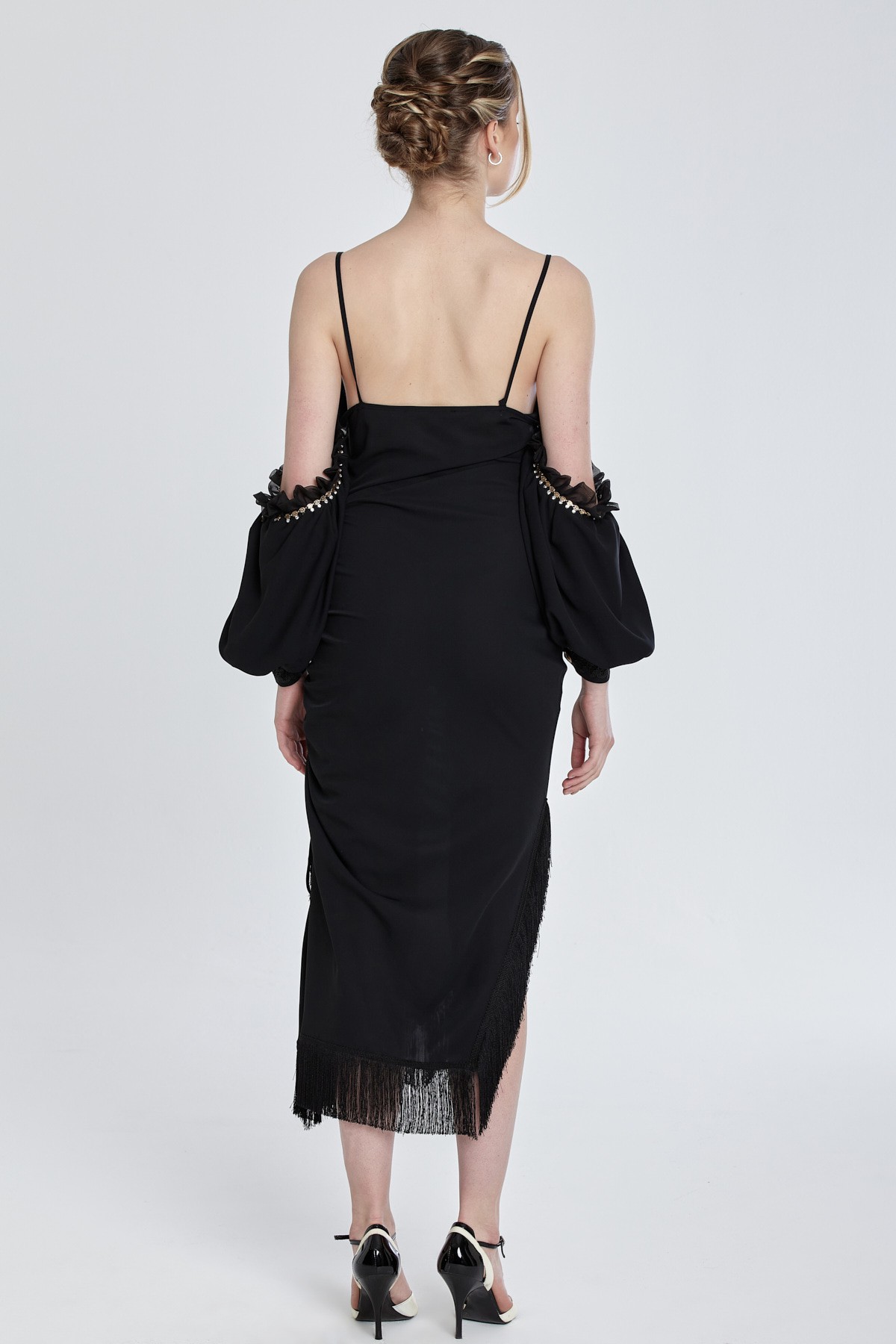 İnce askılı düşük omuz asimetlik kesim etekli etek uçları püskül detaylı midi elbise