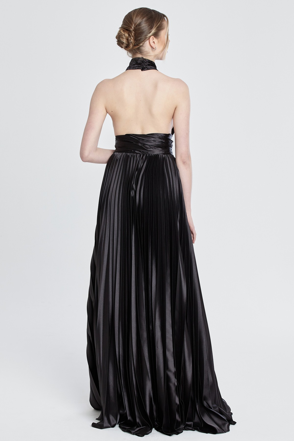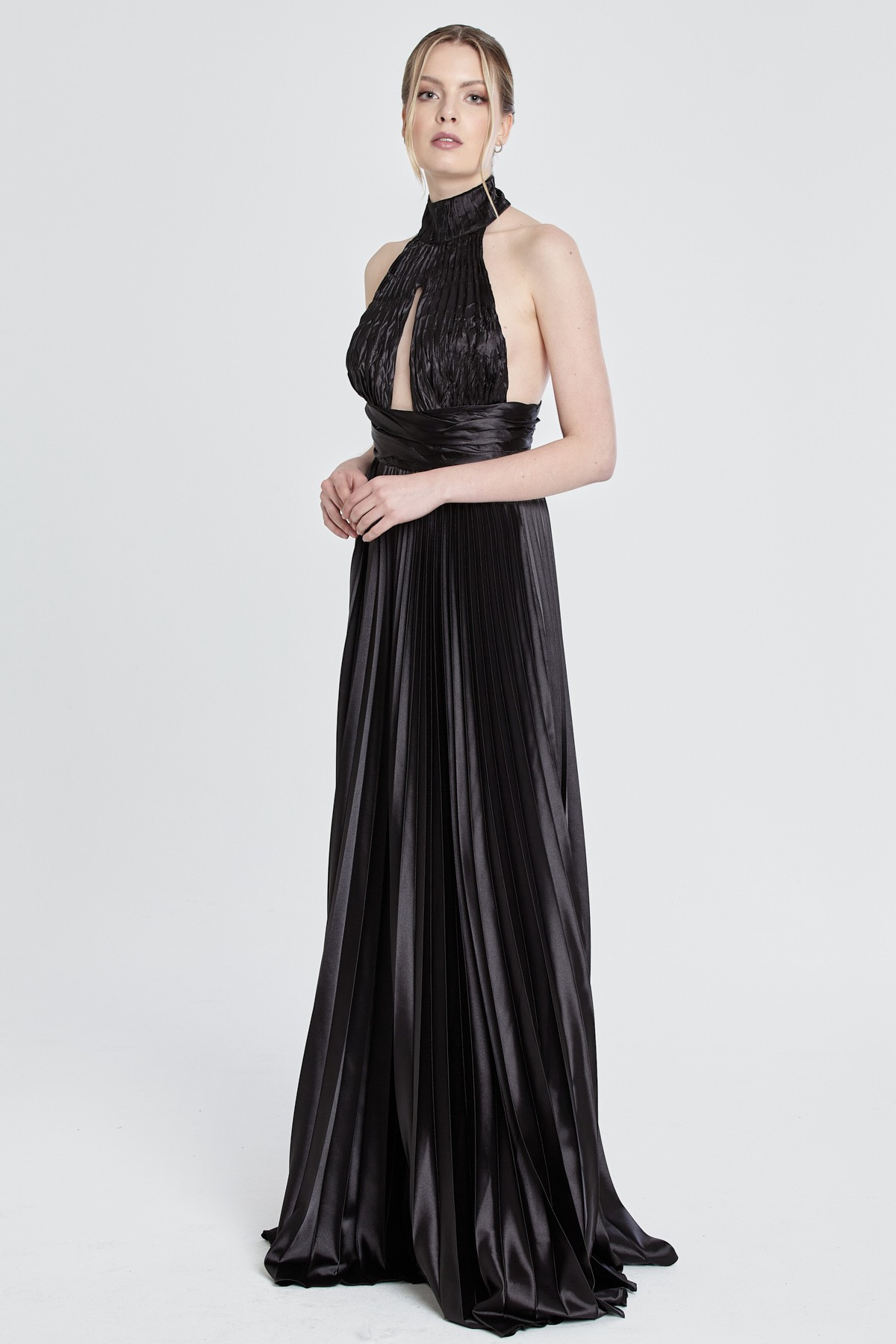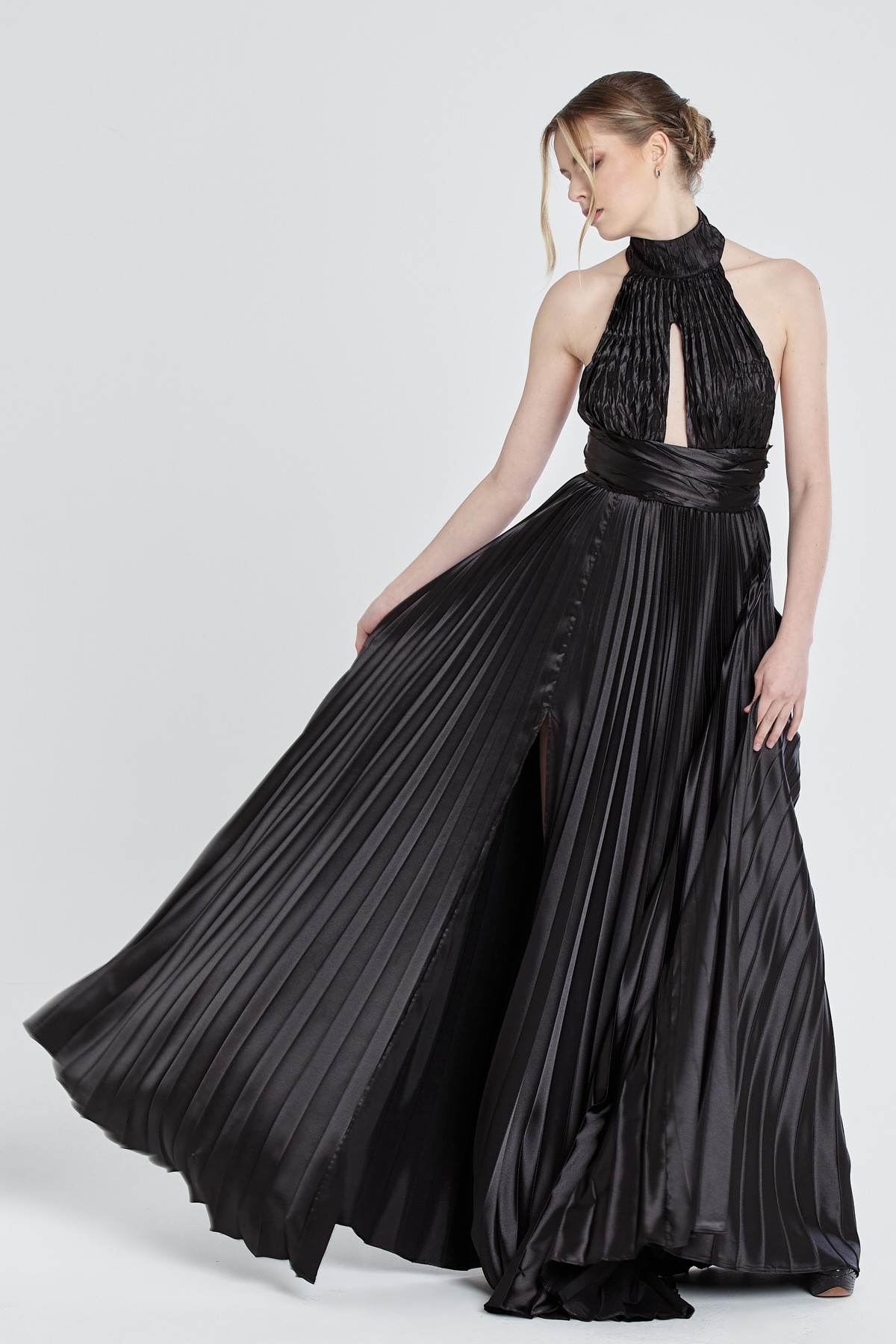 Halter yaka göğüs ve sırt dekolteli beli kemerli etekleri pileli yırtmaçlı saten gece elbisesi