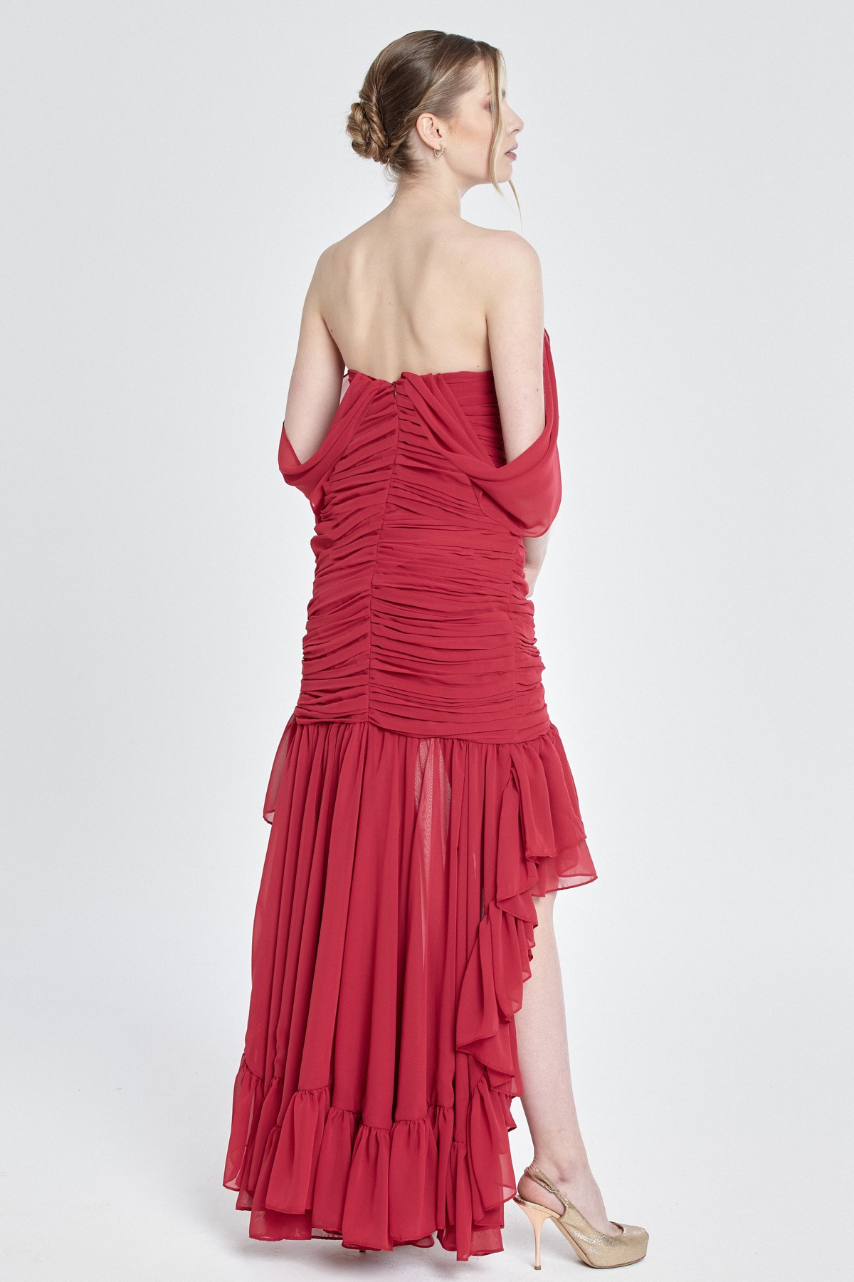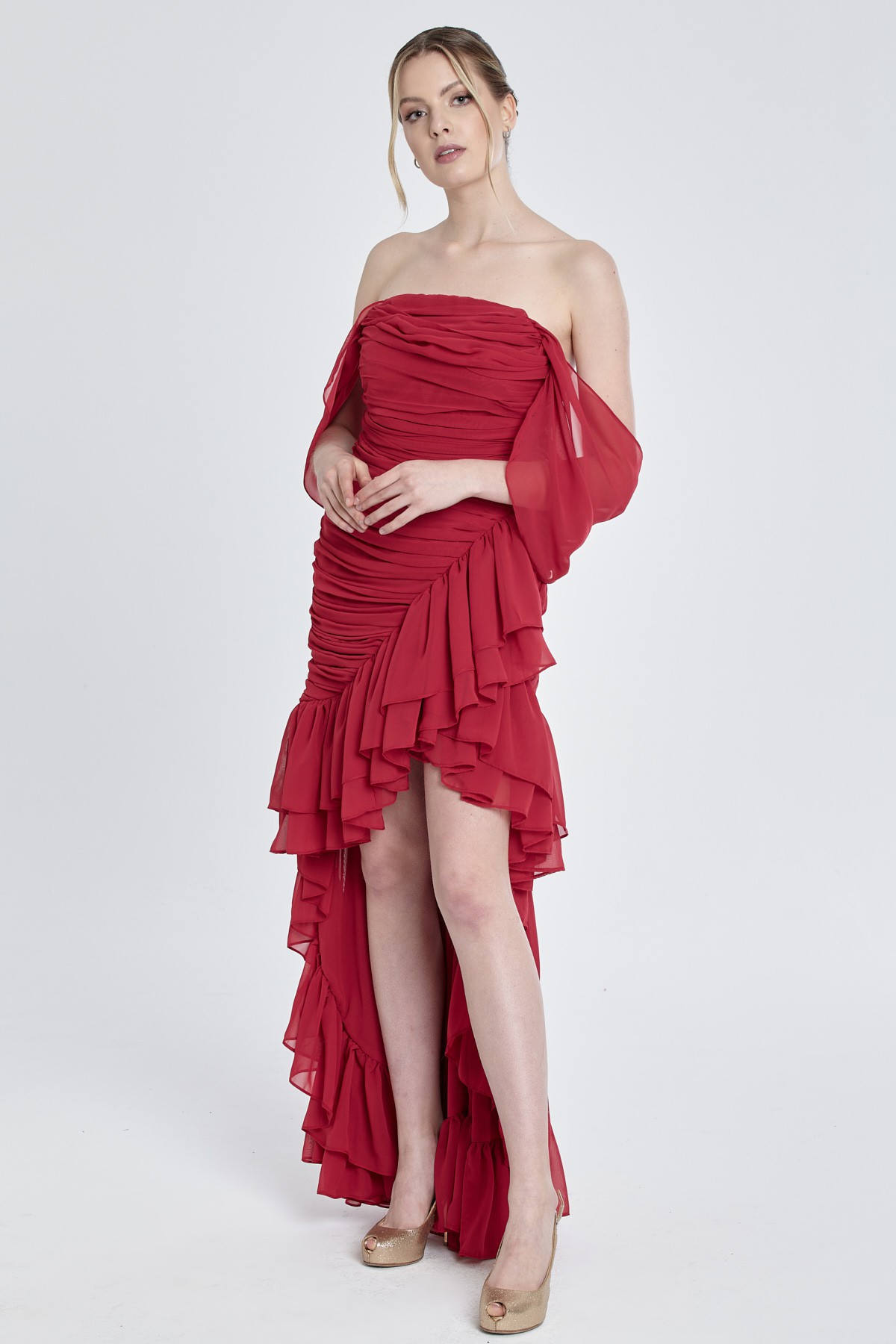 Düşük omuz komple drapeli önü kısa arkası uzun etekleri fırfırlı gece elbisesi