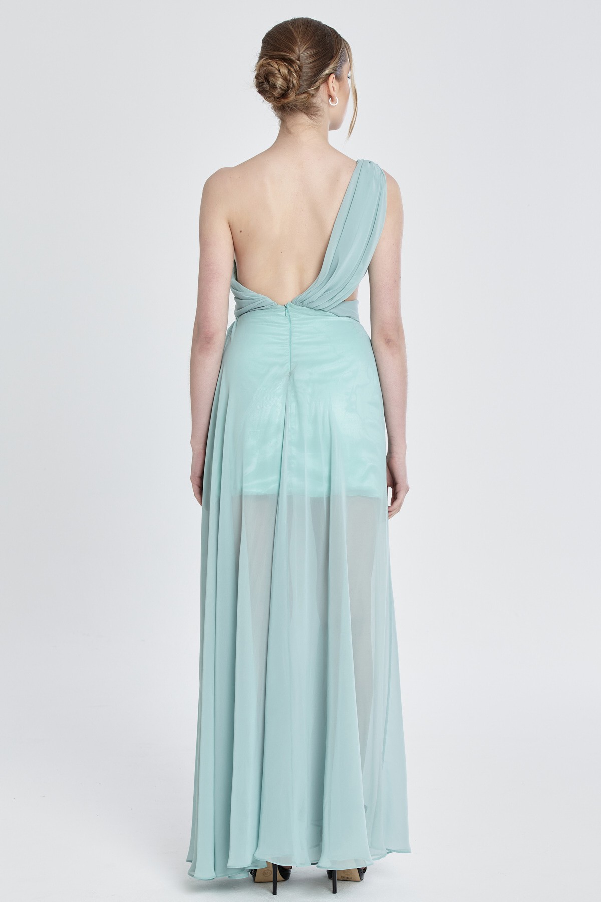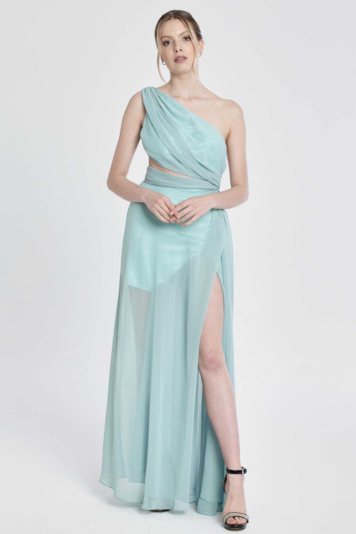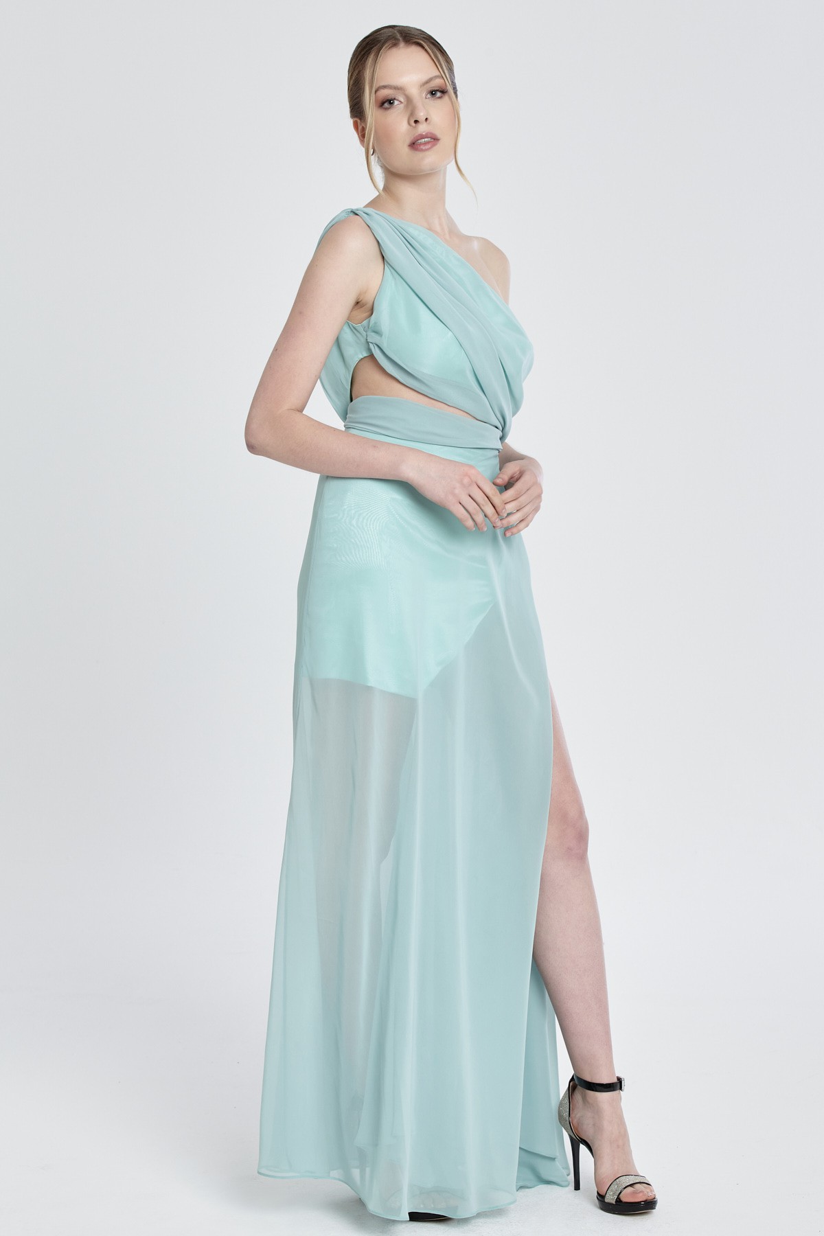 Tek omuz beli açık kısa astarlı şifon gece elbisesi