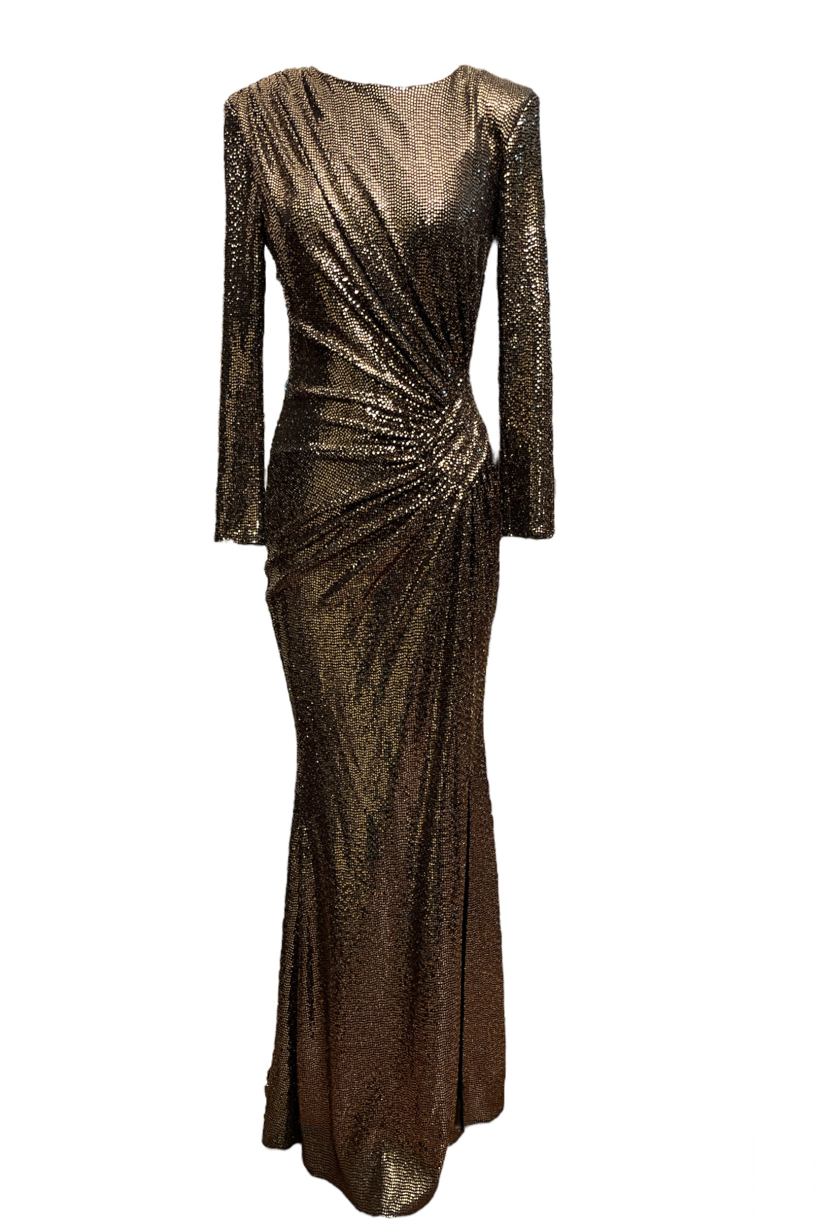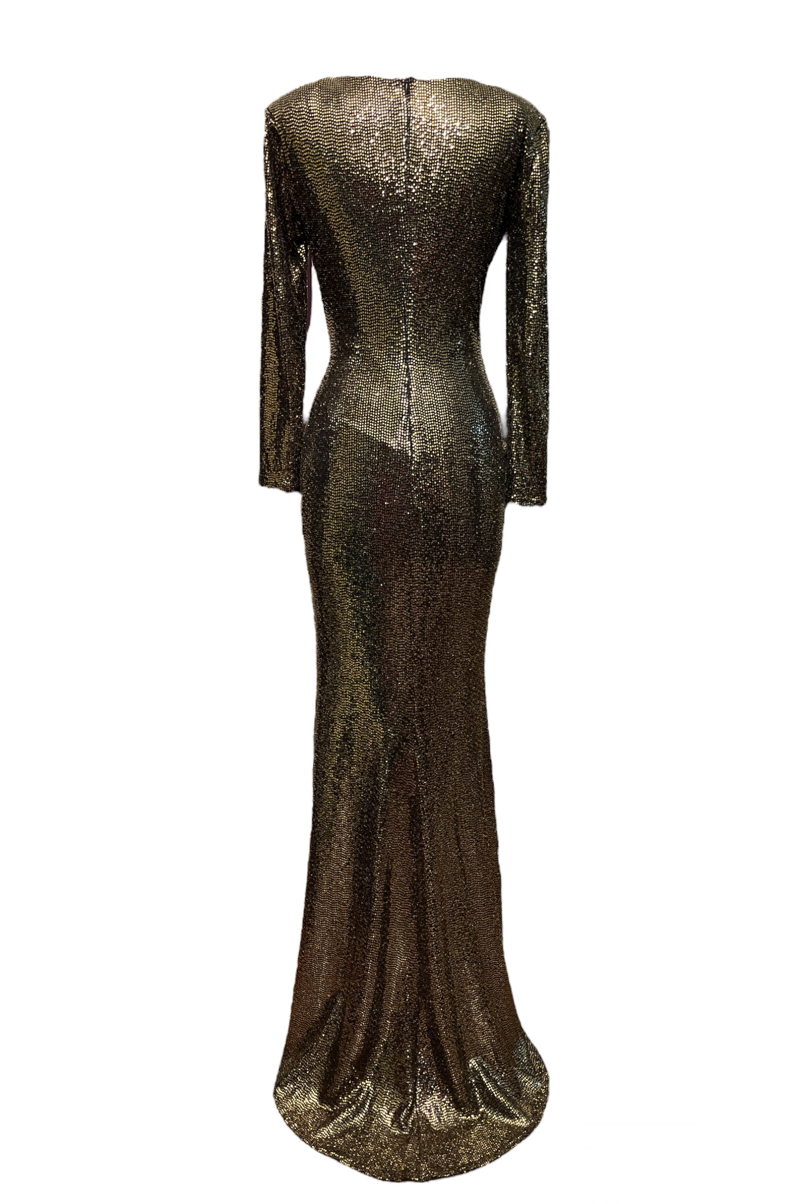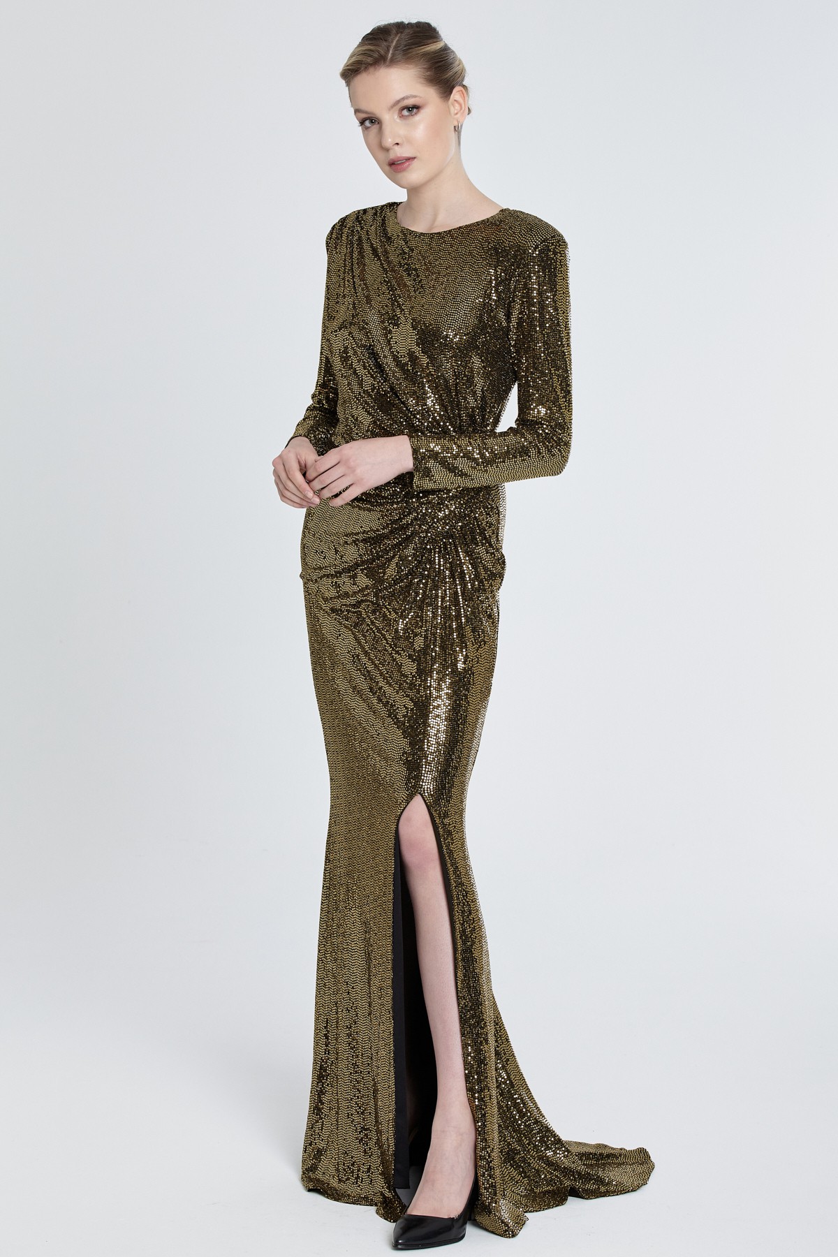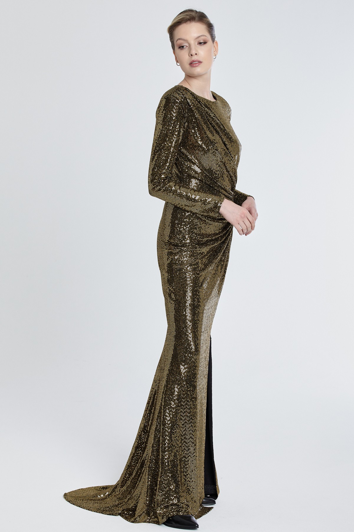 Uzun kollu beli drapeli yırtmaçlı kendinden ışıltılı gece elbisesi
