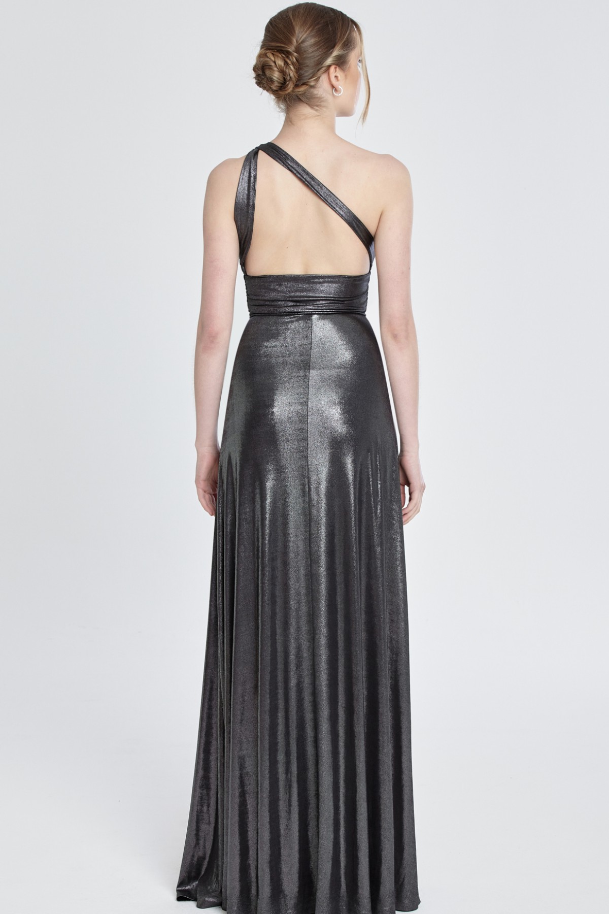 Tek omuz göğüs dekolteli derin yırtmaçlı kendinden ışıltılı metalik gece elbisesi