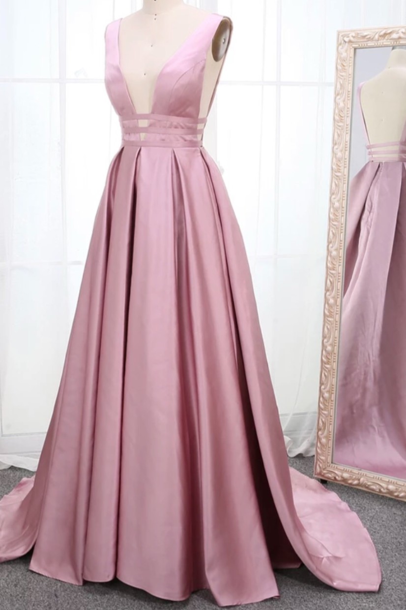 Göğüs ve sırt dekolteli kalın saten pudra pembesi gece elbisesi