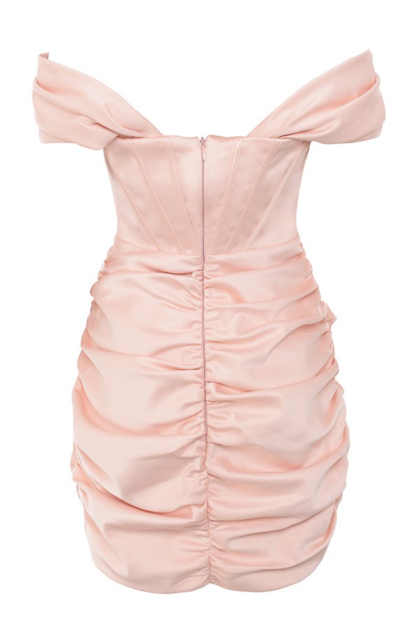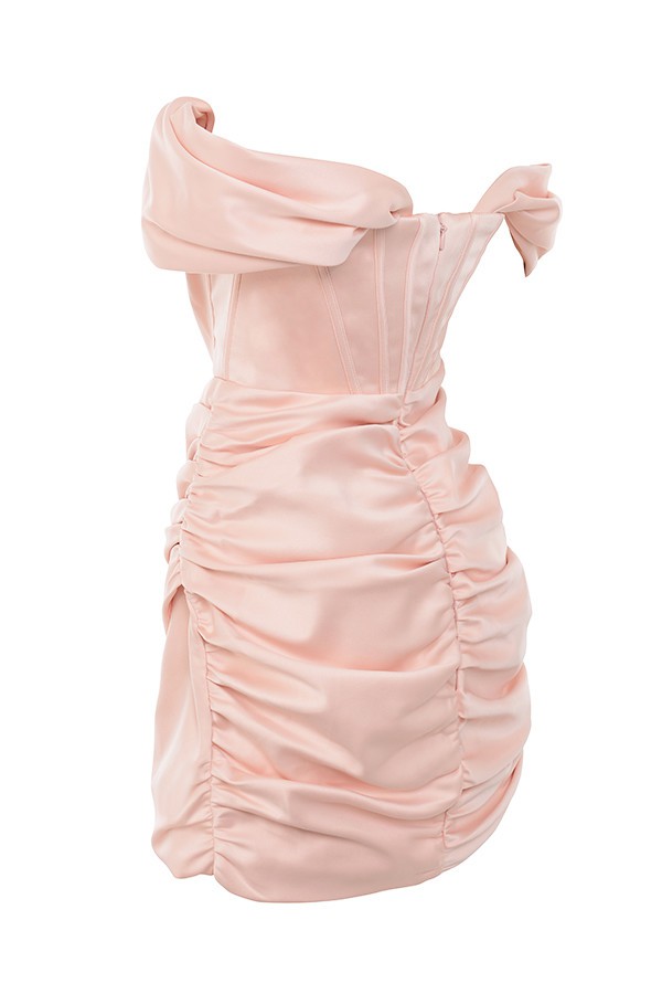 Kalın parlak düşes saten kumaşlı kolları omuzdan sarkan ve göğüs içi kaydırmaz detaylıdı etek kısımları drapeli mini elbise.