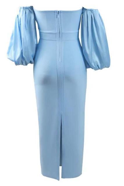 Straplez kalp yaka bodycon vücudu saran ve kalın satenden balon kol midi boy kokteyl elbisesi