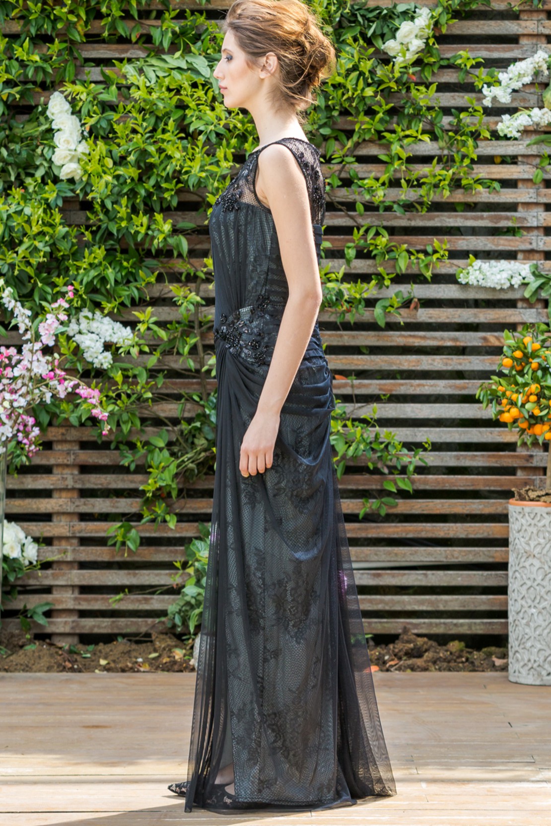 Göğsü Dantel İşlemeli Beli Drapeli Önden Yırtmaçlı Gece Elbisesi