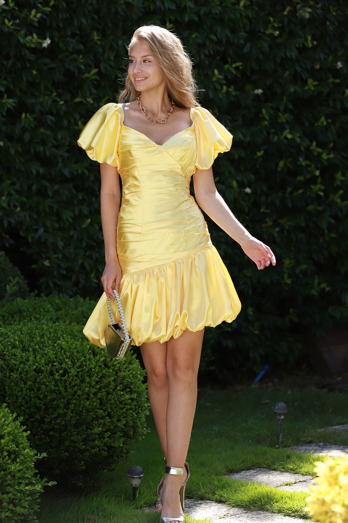 Kalp yaka kolları volanlı drapeli etek kısmı asimetrik balonlu saten mini elbise