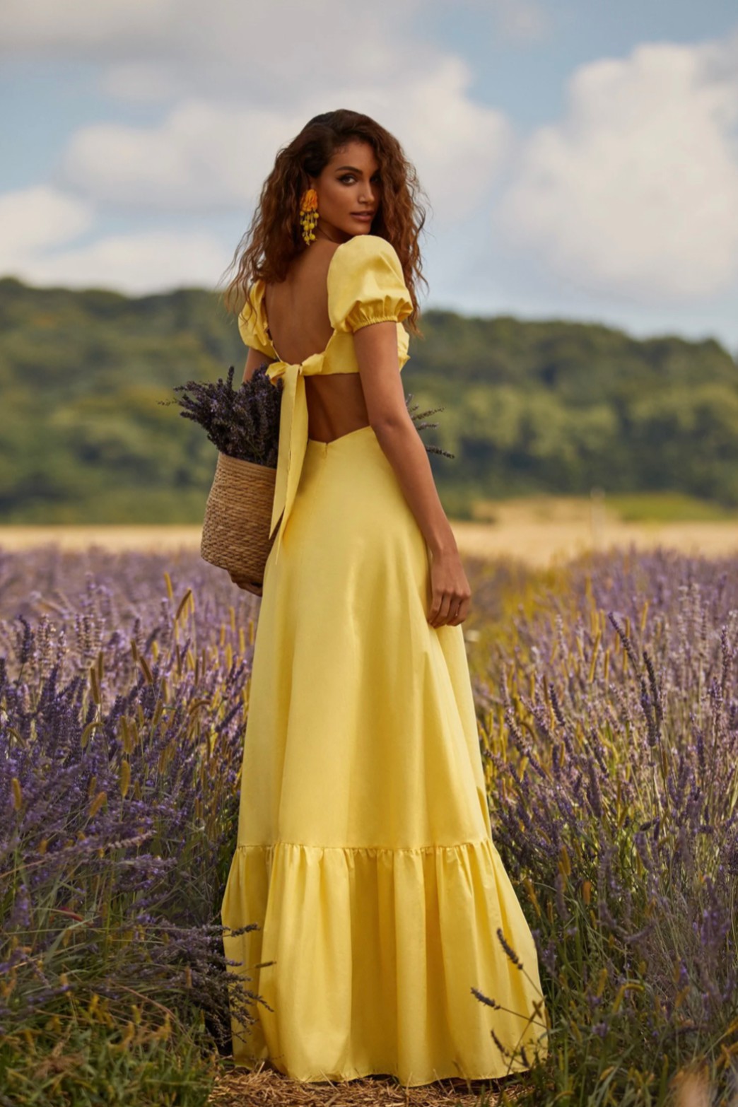 Zahmetsiz yaz stilinizi Kasia elbisemizle yansıtın. Kasia Elbise, kıvrık pileli, yanları oyuklu ve arka papyonlu bir büstiye sahiptir. A kesim silüeti ve kabarık kollu bu poplin maksi elbise, parlak sarı tonuyla tüm dikkatleri üzerine çekiyor.