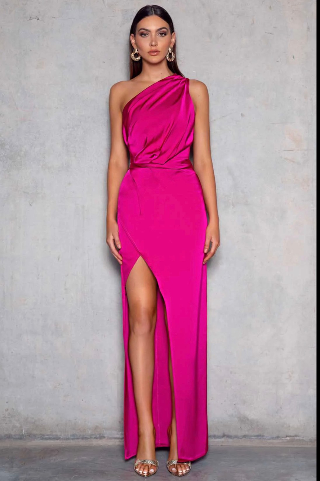 Tek omuz göğüs kısmı drapeli derin yırtmaçlı uzun elbise